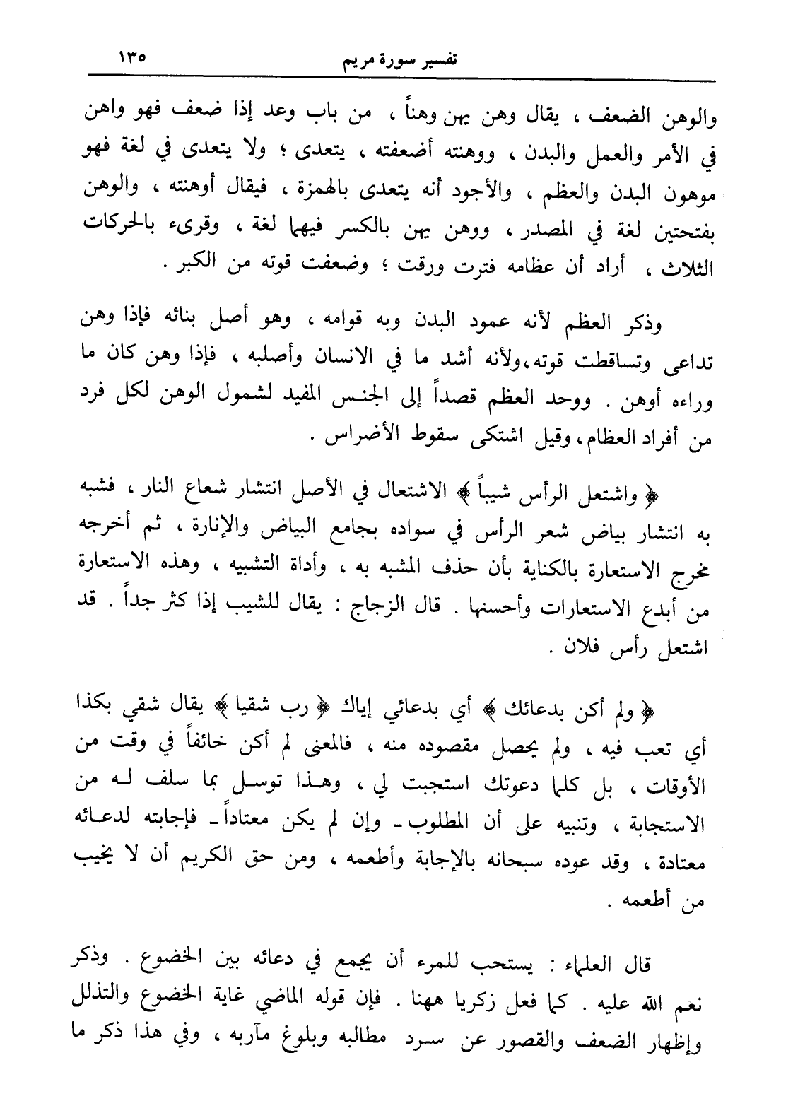 (واشتعل الرأس شيباً) الاشتعال في الأصل انتشار شعاع النار، فشبه به انتشار بياض شعر الرأس في سواده بجامع البياض والإنارة، ثم أخرجه مخرج الاستعارة بالكناية بأن حذف المشبه به، وأداة التشبيه، وهذه الاستعارة من أبدع الاستعارات وأحسنها. قال الزجاج: يقال للشيب إذا كثر جداً. قد اشتعل رأس فلان.