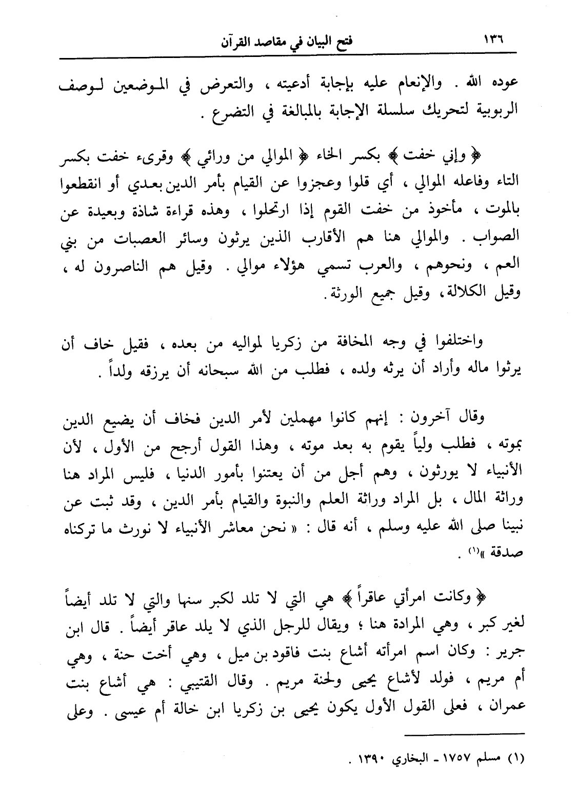 (وإني خفت) بكسر الخاء (الموالي من ورائي) وقرئ خفت بكسر التاء وفاعله الموالي، أي قلوا وعجزوا عن القيام بأمر الدين بعدي أو انقطعوا بالموت، مأخوذ من خفت القوم إذا ارتحلوا، وهذه قراءة شاذة وبعيدة عن الصواب. والموالي هنا هم الأقارب الذين يرثون وسائر العصبات من بني العم، ونحوهم، والعرب تسمي هؤلاء موالي. وقيل هم الناصرون له، وقيل الكلالة، وقيل جميع الورثة.
