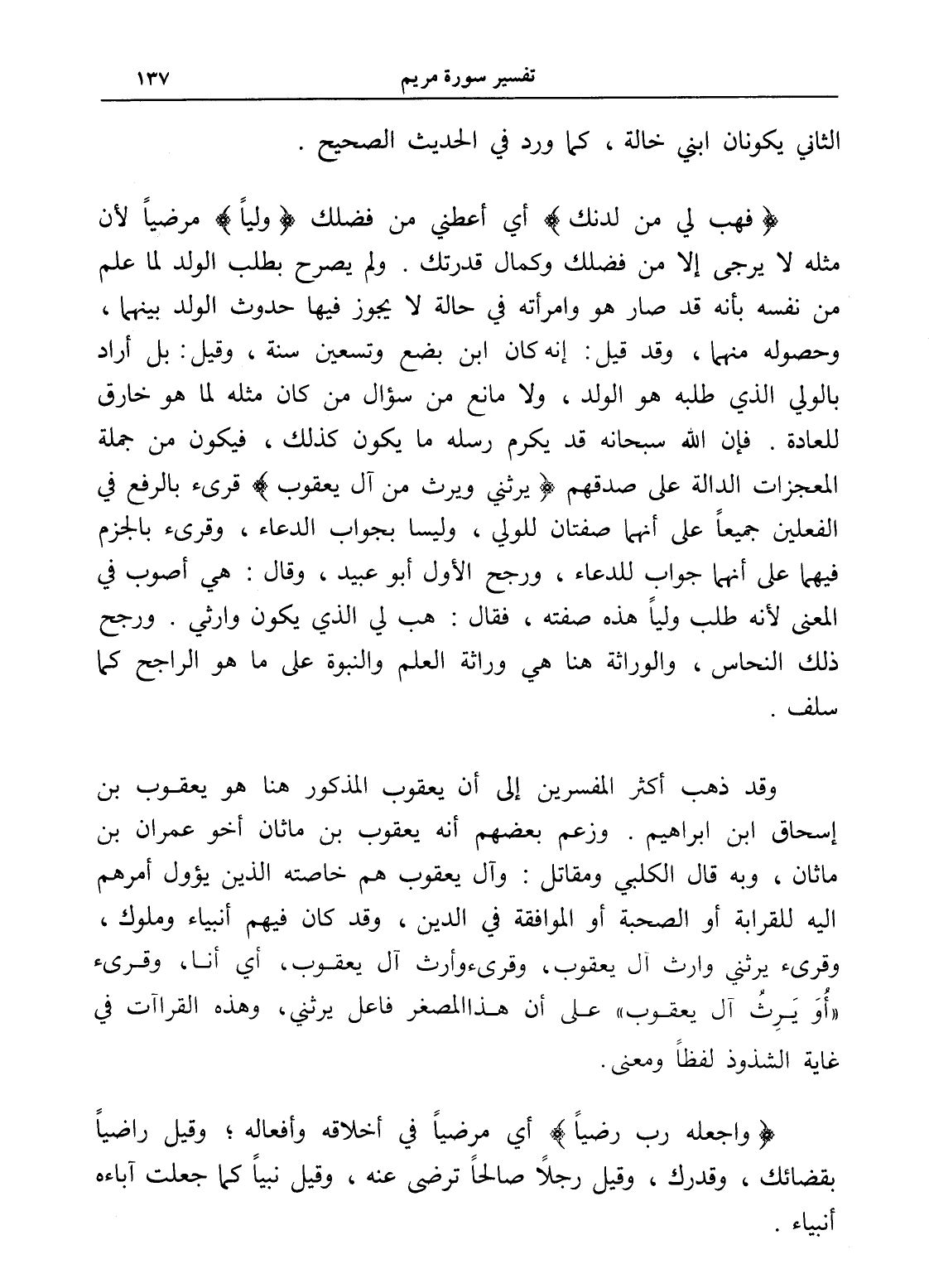 (يرثني ويرث من آل يعقوب) قرئ بالرفع في الفعلين جميعاً على أنهما صفتان للولي، ولمسا بجواب الدعاء، وقرئ بالجزم فيهما على أنهما جواب للدعاء، ورجح الأول أبو عبيد، وقال: هي أصوب في المعنى لأنه طلب ولياً هذه صفته، فقال: هب لي الذي يكون وارثي. ورجح ذلك النحاس، والوراثة هنا هي وراثة العلم والنبوة على ما هو الراجح كما سلف.
