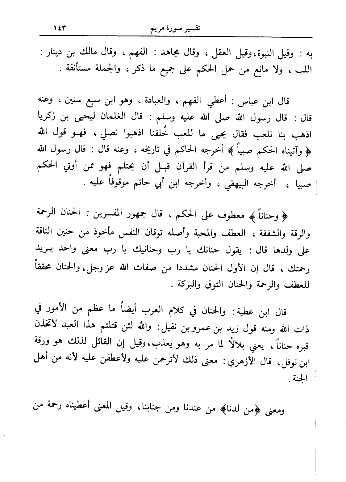 (وحناناً) معطوف على الحكم، قال جمهور المفسرين: الحنان الرحمة والرقة والشفقة، العطف والمحبة وأصله توقان النفس مأخوذ من حنين الناقة على ولدها قال: يقول حنانك يا رب وحنانيك يا رب معنى واحد يريد رحمتك، قال إن الأول الحنان مشدداً من صفات الله عز وجل، والحنان محققاً للعطف والرحمة والحنان التوق والبركة.