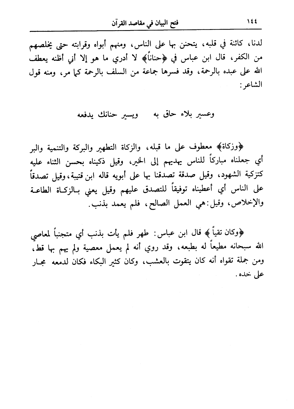 (وزكاة) معطوف على ما قبله، والزكاة التطهير والبركة والتنمية والبر أي جعلناه مباركاً للناس يهديهم إلى الخير، وقيل ذكيناه بحسن الثناء عليه كتزكية الشهود، وقيل صدقة تصدقنا بها على أبويه قاله ابن قتيبة، وقيل تصدقاً على الناس أي أعطيناه توفيقاً للتصدق عليهم وقيل يعني بالزكاة الطاعة والإخلاص، وقيل: هي العمل الصالح، فلم يعمد بذنب.