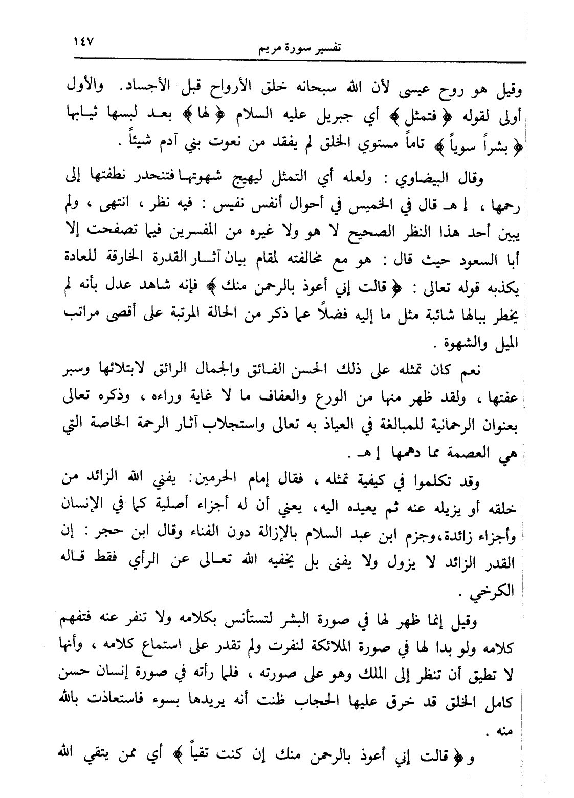 وقال البيضاوي: ولعله أي التمثل ليهيج شهوتها فتنحدر نطفتها إلى رحمها، إهـ قال في الخميس في أحوال أنفس نفيس: فيه نظر، انتهى، ولم يبين أحد هذا النظر الصحيح لا هو ولا غيره من المفسرين فيما تصفحت إلا أبا السعود حيث قال: هو مع مخالفته لمقام بيان آثار القدرة الخارقة للعادة يكذبه قوله تعالى: