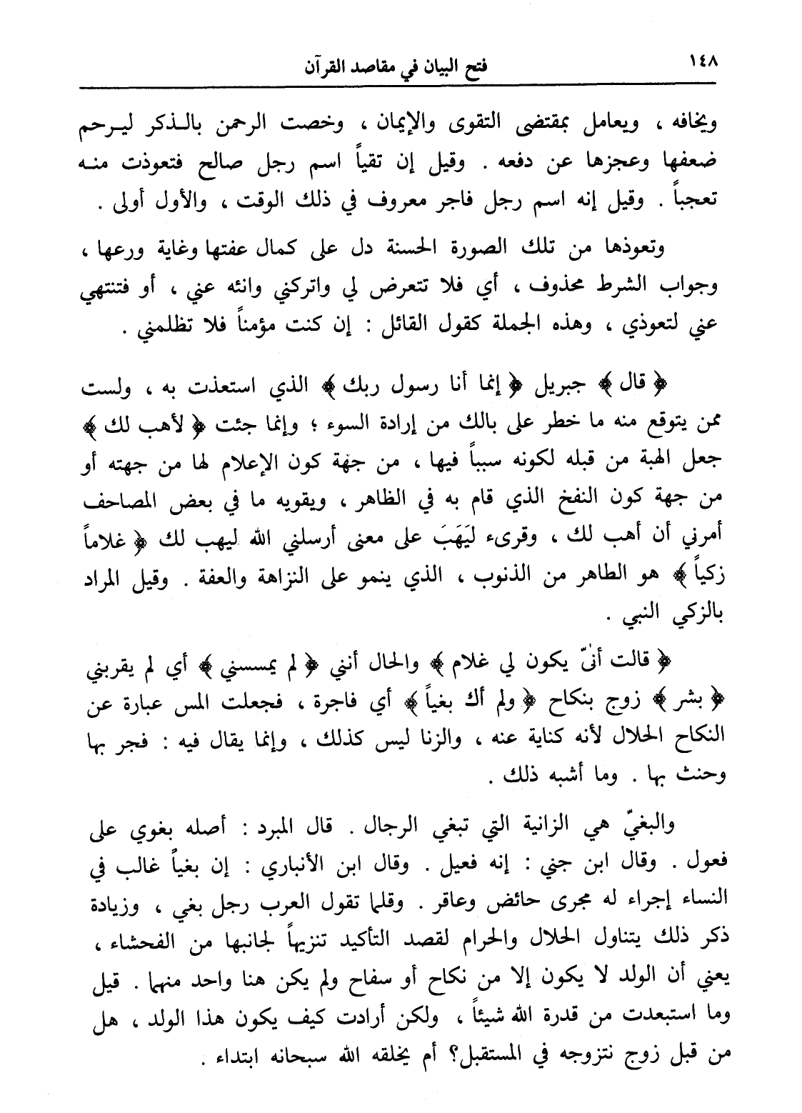 والبغيّ هي الزانية التي تبغي الرجال. قال المبرد: أصله بغوي على فعول. وقال ابن جني: إنه فعيل. وقال ابن الأنباري: أن بغياً غالب في النساء إجراء له مجرى حائض وعاقر. وقلما تقول العرب رجل بغي، وزيادة ذكر ذلك يتناول الحلال والحرام لقصد التأكيد تنزيهاً لجانبها من الفحشاء، يعني أن الولد لا يكون إلا من نكاح أو سفاح ولم يكن هنا واحد منهما. قيل وما استبعدت من قدرة الله شيئاً، ولكن أرادت كيف يكون هذا الولد، هل من قبل زوج نتزوجه في المستقبل؟ أم يخلقه الله سبحانه ابتداء.