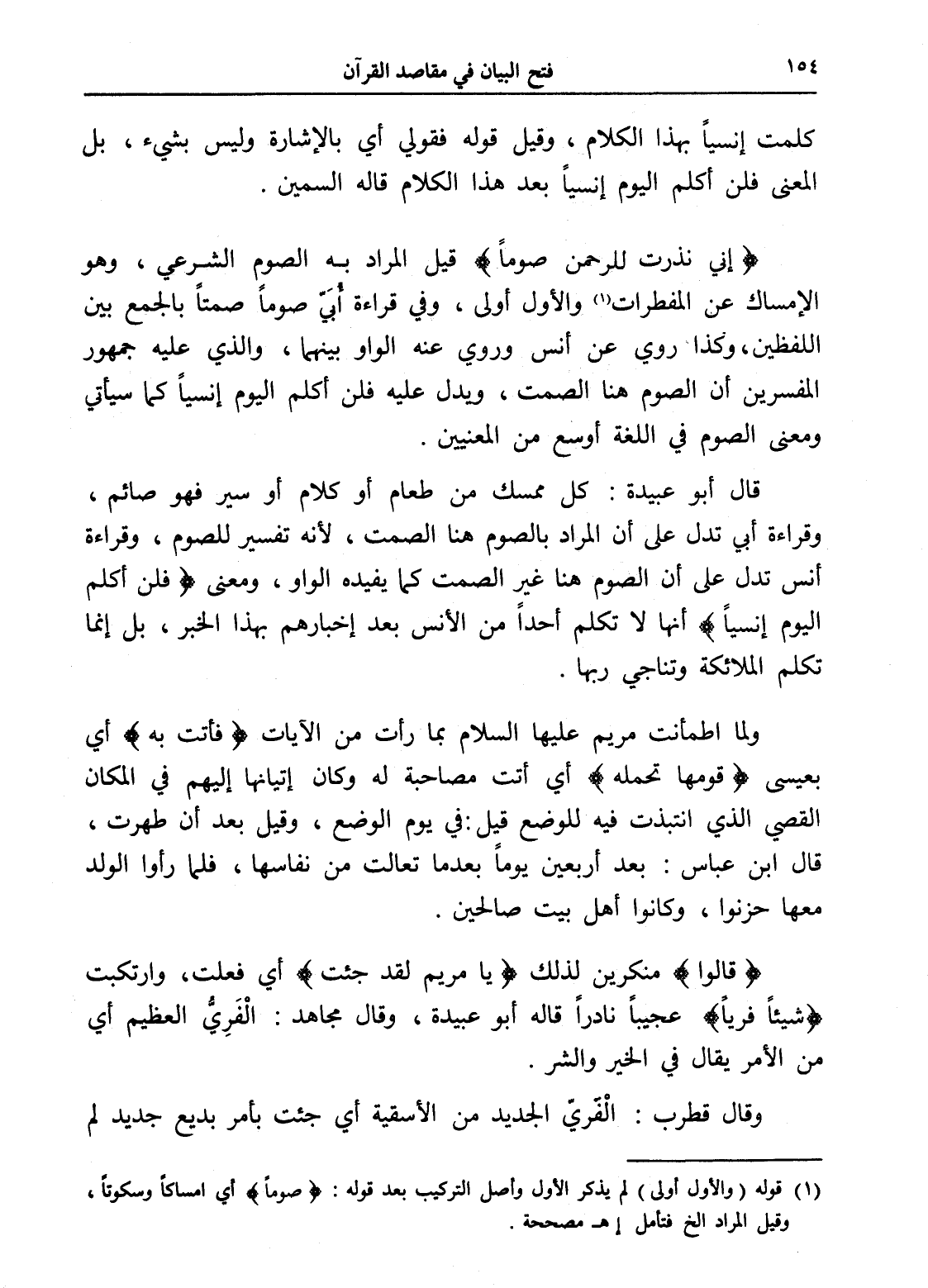 قال أبو عبيدة: كل ممسك من طعام أو كلام أو سير فهو صائم، وقراءة أبي تدل على أن المراد بالصوم هنا الصمت، لأنه تفسير للصوم، وقراءة أنس تدل على أن الصوم هنا غير الصمت كما يفيده الواو، ومعنى (فلن أكلم اليوم إنسياً) أنها لا تكلم أحداً من الإنس بعد إخبارهم بهذا الخبر، بل إنما تكلم الملائكة وتناجي ربها.