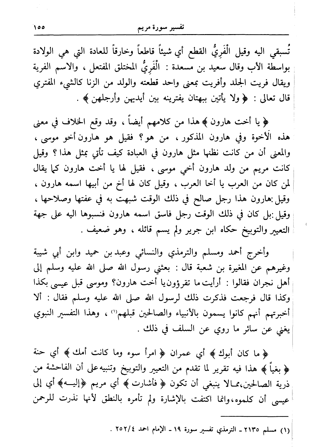 وأخرج أحمد ومسلم والترمذي والنسائي وعبد بن حميد وابن أبي شيبة وغيرهم عن المغيرة بن شعبة قال: بعثني رسول الله صلى الله عليه وسلم إلى أهل نجران فقالوا: أرأيت ما تقرؤون يا أخت هارون؟ وموسى قبل عيسى بكذا وكذا قال فرجعت فذكرت ذلك لرسول الله صلى الله عليه وسلم فقال: " ألا أخبرتهم أنهم كانوا يسمون بالأنبياء والصالحين قبلهم " (¬1)، وهذا التفسير النبوي يغني عن سائر ما روي عن السلف في ذلك.