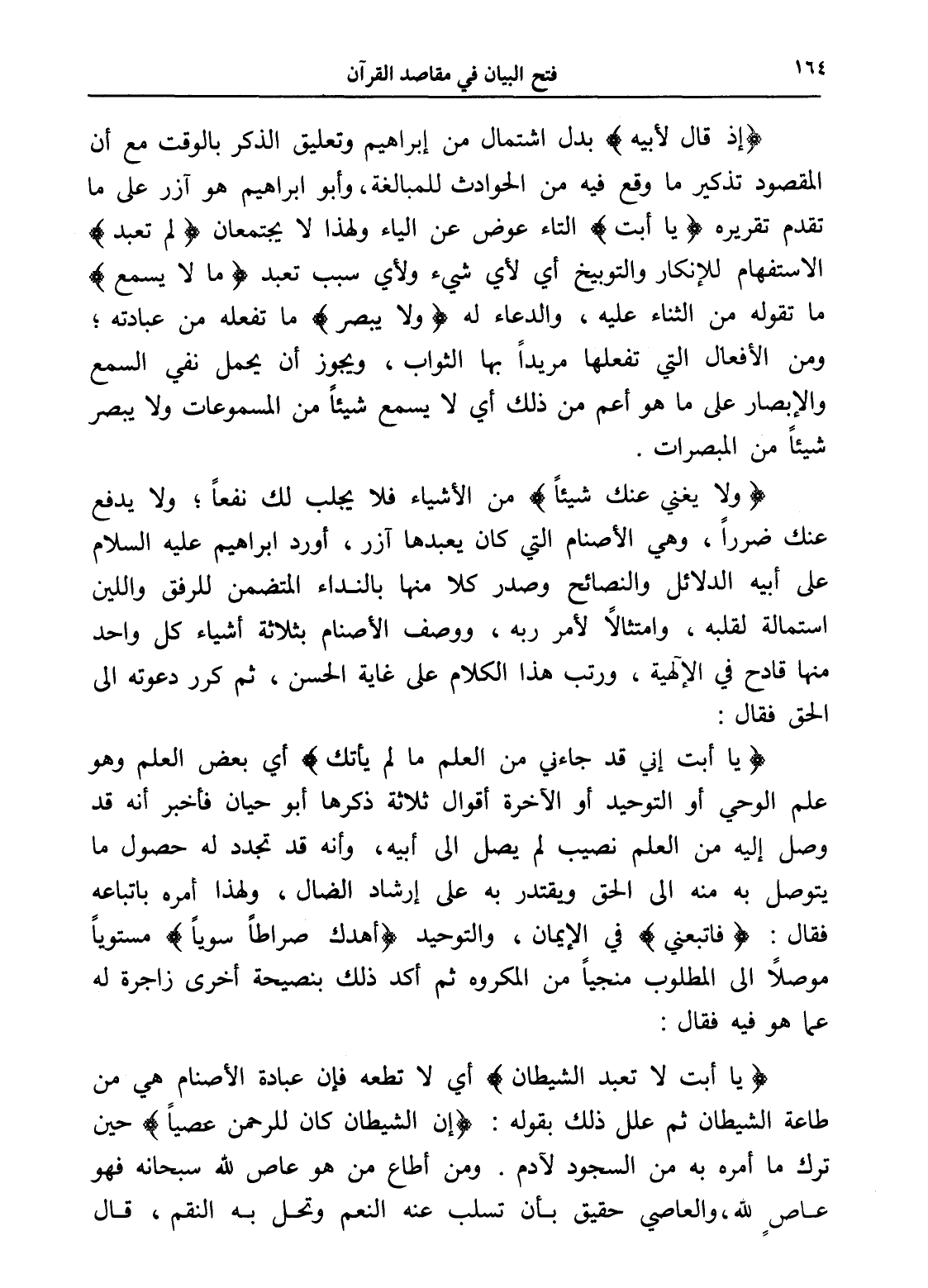 (ولا يغني عنك شيئاً) من الأشياء فلا يجلب لك نفعاً؛ ولا يدفع عنك ضرراً، وهي الأصنام التي كان يعبدها آزر، أورد إبراهيم عليه السلام على أبيه الدلائل والنصائح وصدر كلا منها بالنداء المتضمن للرفق واللين استمالة لقلبه، وامتثالاً لأمر ربه، ووصف الأصنام بثلاثة أشياء كل واحد منها قادح في الإلهية، ورتب هذا الكلام على غاية الحسن، ثم كرر دعوته إلى الحق فقال: