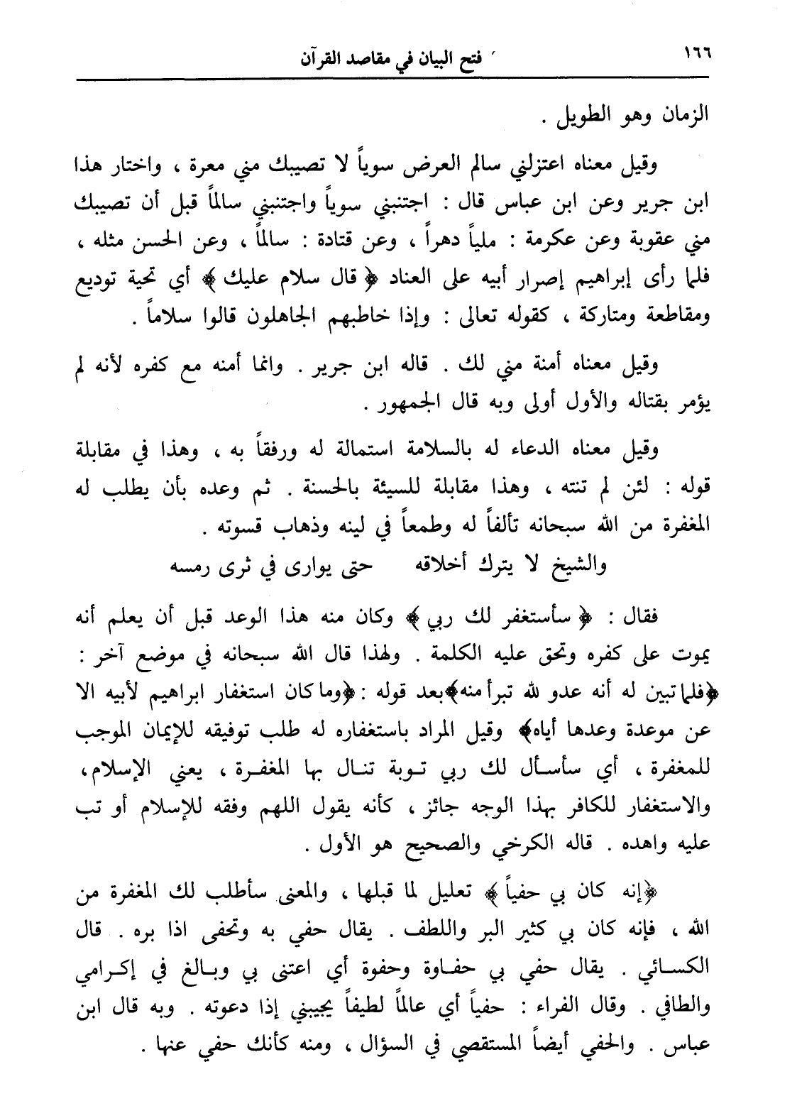 وقيل معناه اعتزلني سالم العرض سوياً لا تصيبك مني معرة، واختار هذا ابن جرير وعن ابن عباس قال: اجتنبني سوياً واجتنبني سالماً قبل أن تصيبك مني عقوبة وعن عكرمة: ملياً دهراً، وعن قتادة: سالماً، وعن الحسن مثله، فلما رأى إبراهيم إصرار أبيه على العناد