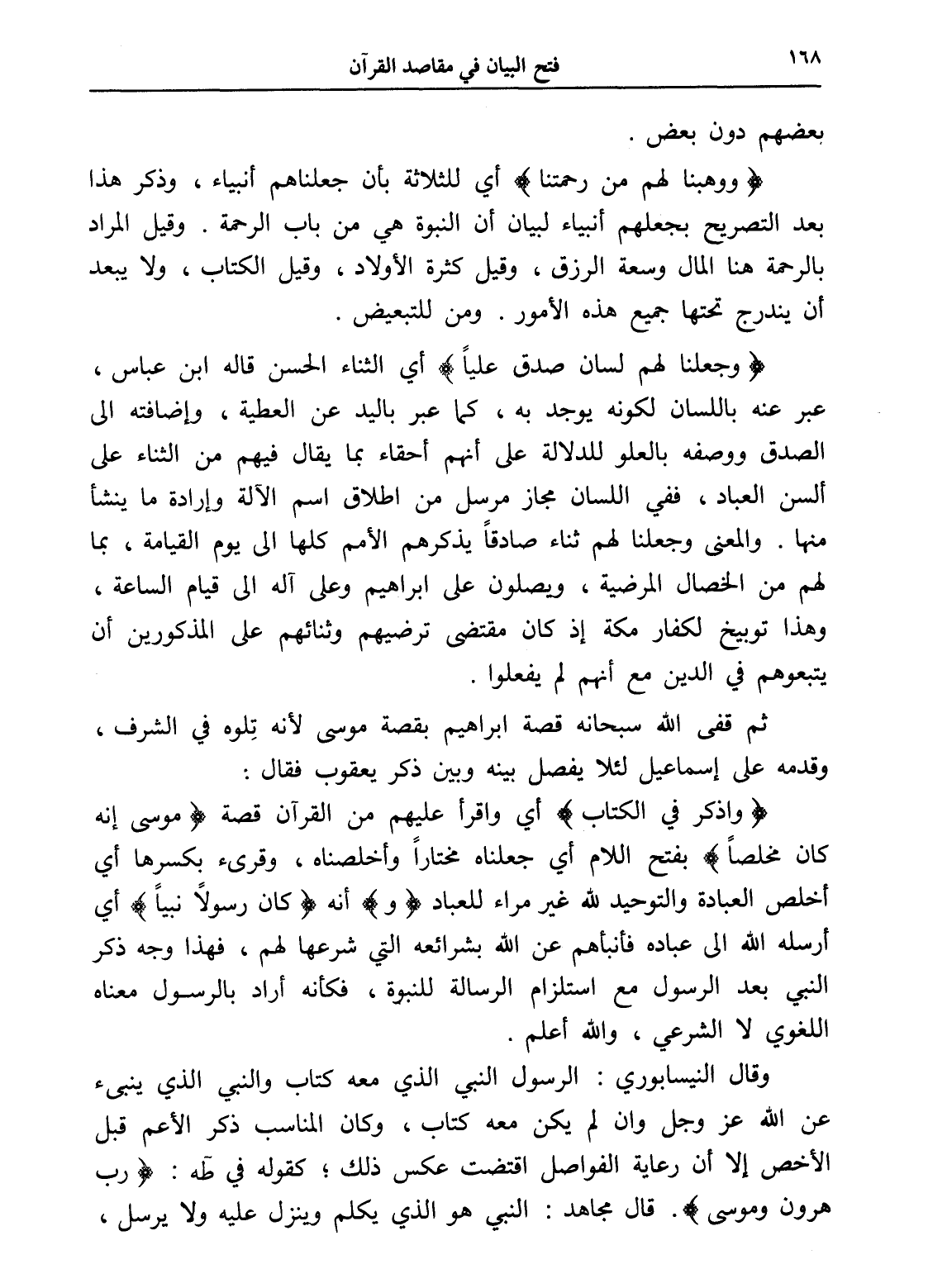 (واذكر في الكتاب) أي واقرأ عليهم من القرآن قصة (موسى إنه كان مخلصاً) بفتح اللام أي جعلناه مختاراً وأخلصناه، وقرئ بكسرها أي أخلص العبادة والتوحيد لله غير مراء للعباد (و) أنه (كان رسولاً نبياً) أي أرسله الله إلى عباده فأنبأهم عن الله بشرائعه التي شرعها لهم، فهذا وجه ذكر النبي بعد الرسول مع استلزام الرسالة للنبوة، فكأنه أراد بالرسول معناه اللغوي لا الشرعي، والله أعلم.