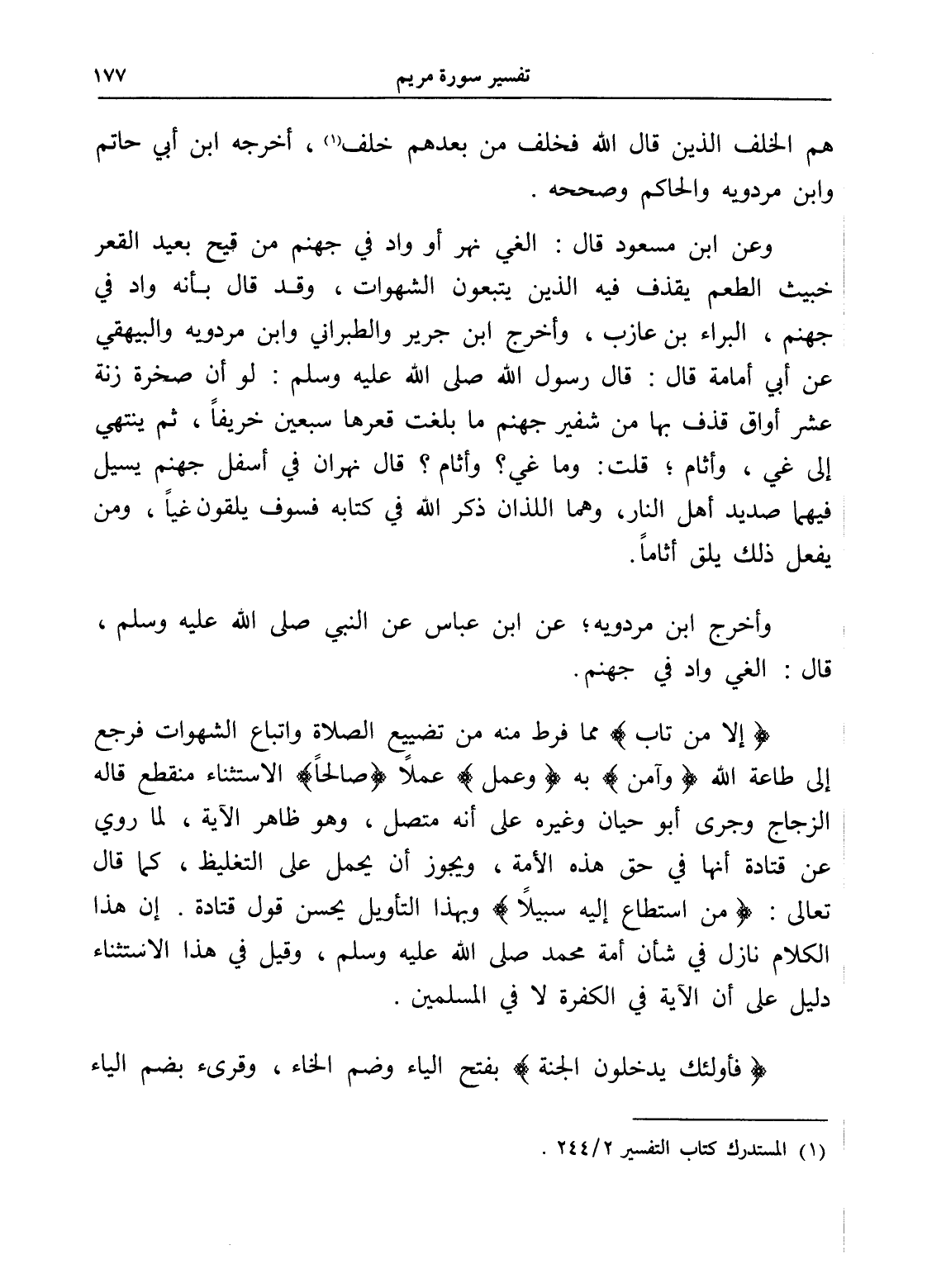 وعن ابن مسعود قال: الغي نهر أو واد في جهنم من قيح بعيد القعر خبيث الطعم يقذف فيه الذين يتبعون الشهوات، وقد قال بأنه واد في جهنم، البراء بن عازب، وأخرج ابن جرير والطبراني وابن مردويه والبيهقي عن أبي أمامة قال: قال رسول الله صلى الله عليه وسلم: " لو أن صخرة زنة عشر أواق قذف بها من شفير جهنم ما بلغت قعرها سبعين خريفاً، ثم ينتهي إلى غي، وأثام "؛ قلت: وما غي؟ وأثام؟ قال " نهران في أسفل جهنم يسيل فيهما صديد أهل النار، وهما اللذان ذكر الله في كتابه فسوف يلقون غياً "، ومن يفعل ذلك يلق أثاماً.