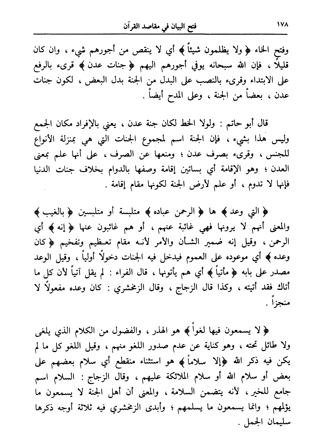 قال أبو حاتم: ولولا الخط لكان جنة عدن، يعني بالإفراد مكان الجمع وليس هذا بشيء، فإن الجنة اسم لمجموع الجنات التي هي بمنزلة الأنواع للجنس، وقرئ بصرف عدن؛ ومنعها عن الصرف، على أنها علم بمعنى العدن؛ وهو الإقامة أي بساتين إقامة وصفها بالدوام بخلاف جنات الدنيا فإنها لا تدوم، أو علم لأرض الجنة لكونها مقام إقامة.