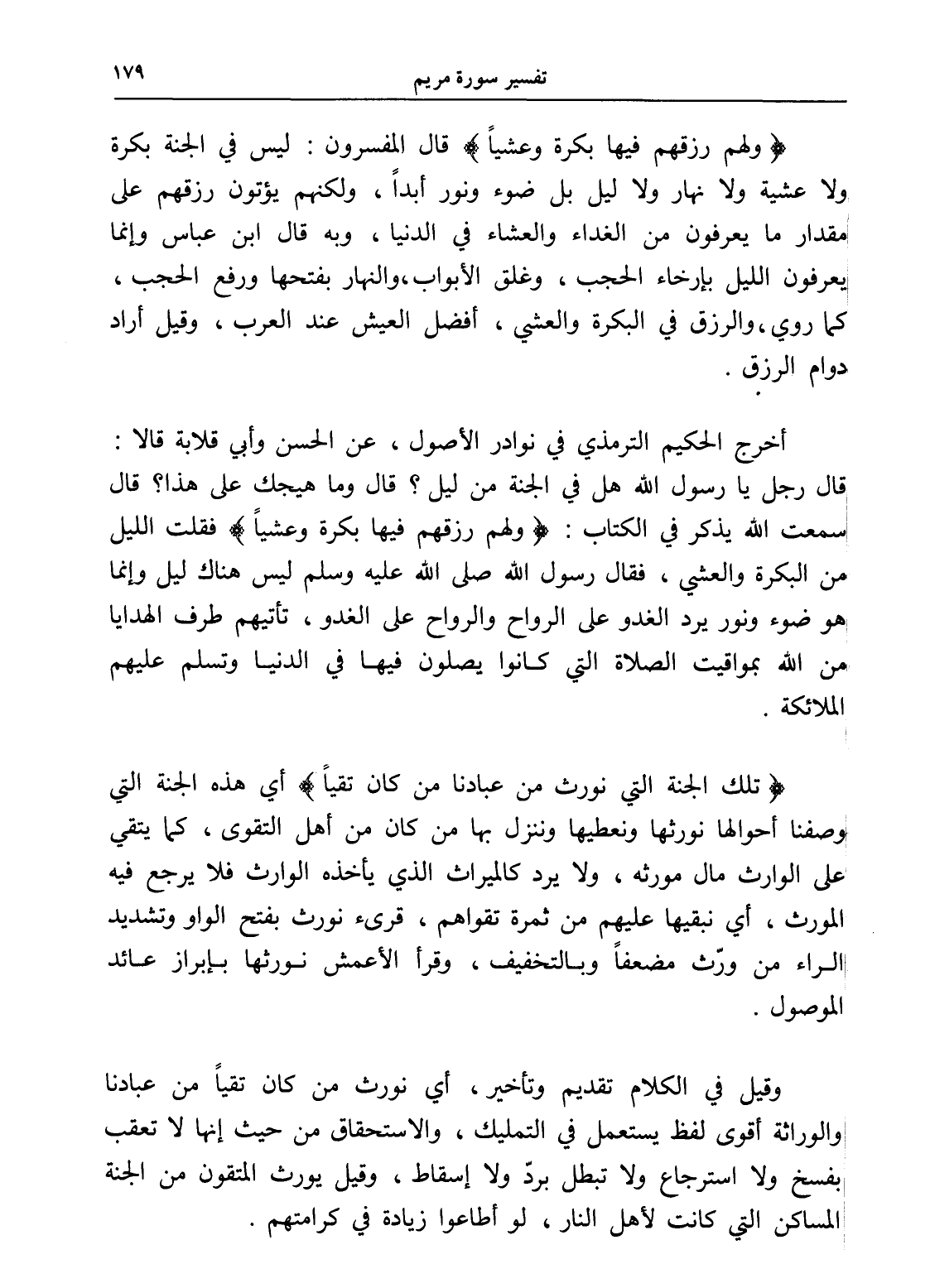(تلك الجنة التي نورث من عبادنا من كان تقياً) أي هذه الجنة التي وصفنا أحوالها نورثها ونعطيها وننزل بها من كان من أهل التقوى، كما يتقي على الوارث مال مورثه، ولا يرد كالميراث الذي يأخذه الوارث فلا يرجع فيه المورث، أي نبقيها عليهم من ثمرة تقواهم، قرئ نورث بفتح الواو وتشديد الراء من ورّث مضعفاً وبالتخفيف، وقرأ الأعمش نورثها بإبراز عائد الموصول.