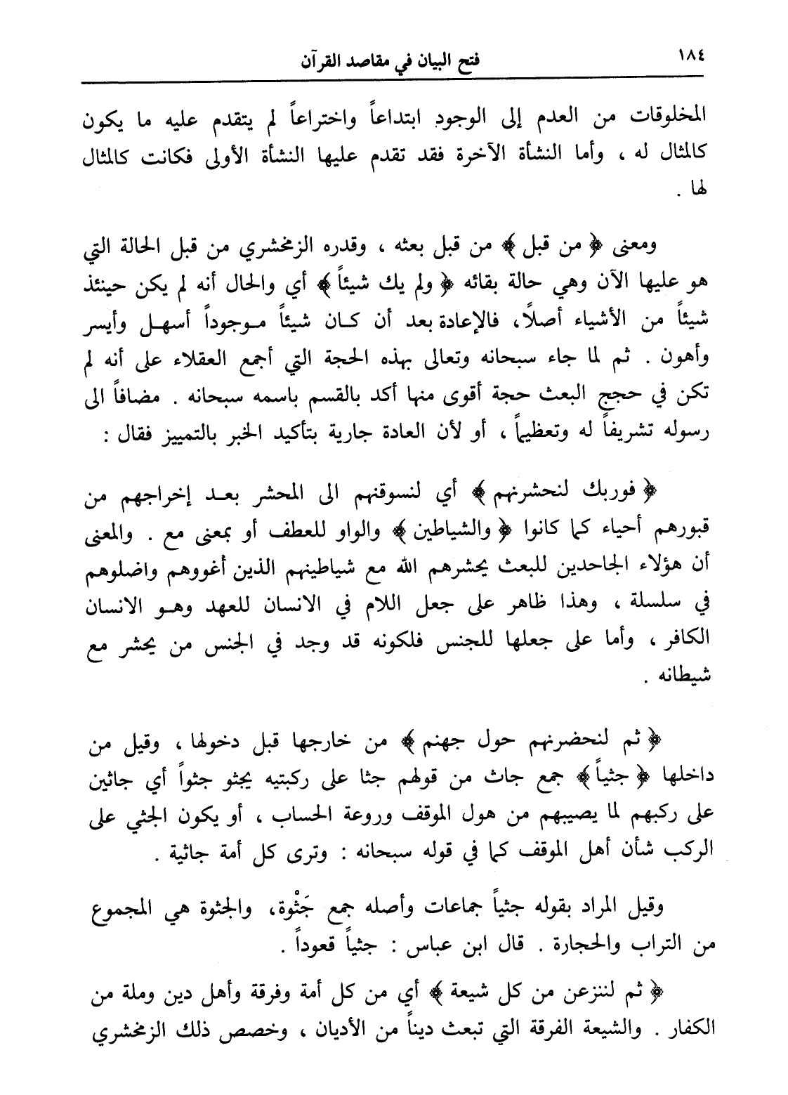 (فوربك لنحشرنهم) أي لنسوقنهم إلى المحشر بعد إخراجهم من قبورهم أحياء كما كانوا (والشياطين) والواو للعطف أو بمعنى مع. والمعنى أن هؤلاء الجاحدين للبعث يحشرهم الله مع شياطينهم الذين أغووهم وأضلوهم في سلسلة، وهذا ظاهر على جعل اللام في الإنسان للعهد وهو الإنسان الكافر، وأما على جعلها للجنس فلكونه قد وجد في الجنس من يحشر مع شيطانه.