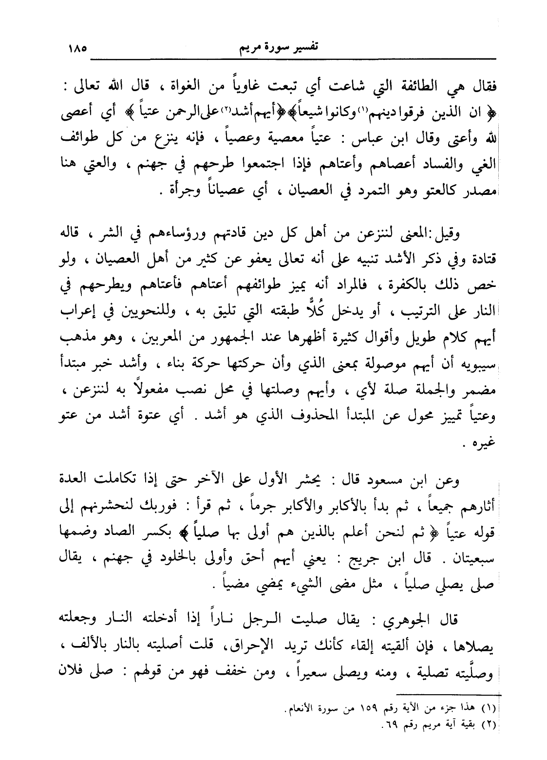 فقال هي الطائفة التي شاعت أي تبعت غاوياً من الغواة، قال الله تعالى: (إن الذين فرقوا دينهم (¬1) وكانوا شيعاً) (أيهم أشد (¬2) على الرحمن عتياً) أي أعصى لله وأعتى وقال ابن عباس: عتياً معصية وعصياً، فإنه ينزع من كل طوائف الغي والفساد أعصاهم وأعتاهم فإذا اجتمعوا طرحهم في جهنم، والعتي هنا مصدر كالعتو وهو التمرد في العصيان، أي عصياناً وجرأة.