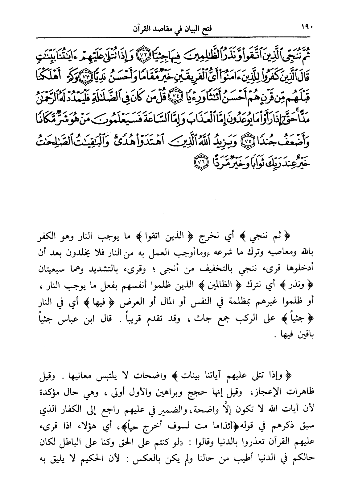 ثُمَّ نُنَجِّي الَّذِينَ اتَّقَوْا وَنَذَرُ الظَّالِمِينَ فِيهَا جِثِيًّا (72) وَإِذَا تُتْلَى عَلَيْهِمْ آيَاتُنَا بَيِّنَاتٍ قَالَ الَّذِينَ كَفَرُوا لِلَّذِينَ آمَنُوا أَيُّ الْفَرِيقَيْنِ خَيْرٌ مَقَامًا وَأَحْسَنُ نَدِيًّا (73) وَكَمْ أَهْلَكْنَا قَبْلَهُمْ مِنْ قَرْنٍ هُمْ أَحْسَنُ أَثَاثًا وَرِئْيًا (74) قُلْ مَنْ كَانَ فِي الضَّلَالَةِ فَلْيَمْدُدْ لَهُ الرَّحْمَنُ مَدًّا حَتَّى إِذَا رَأَوْا مَا يُوعَدُونَ إِمَّا الْعَذَابَ وَإِمَّا السَّاعَةَ فَسَيَعْلَمُونَ مَنْ هُوَ شَرٌّ مَكَانًا وَأَضْعَفُ جُنْدًا (75) وَيَزِيدُ اللَّهُ الَّذِينَ اهْتَدَوْا هُدًى وَالْبَاقِيَاتُ الصَّالِحَاتُ خَيْرٌ عِنْدَ رَبِّكَ ثَوَابًا وَخَيْرٌ مَرَدًّا (76)