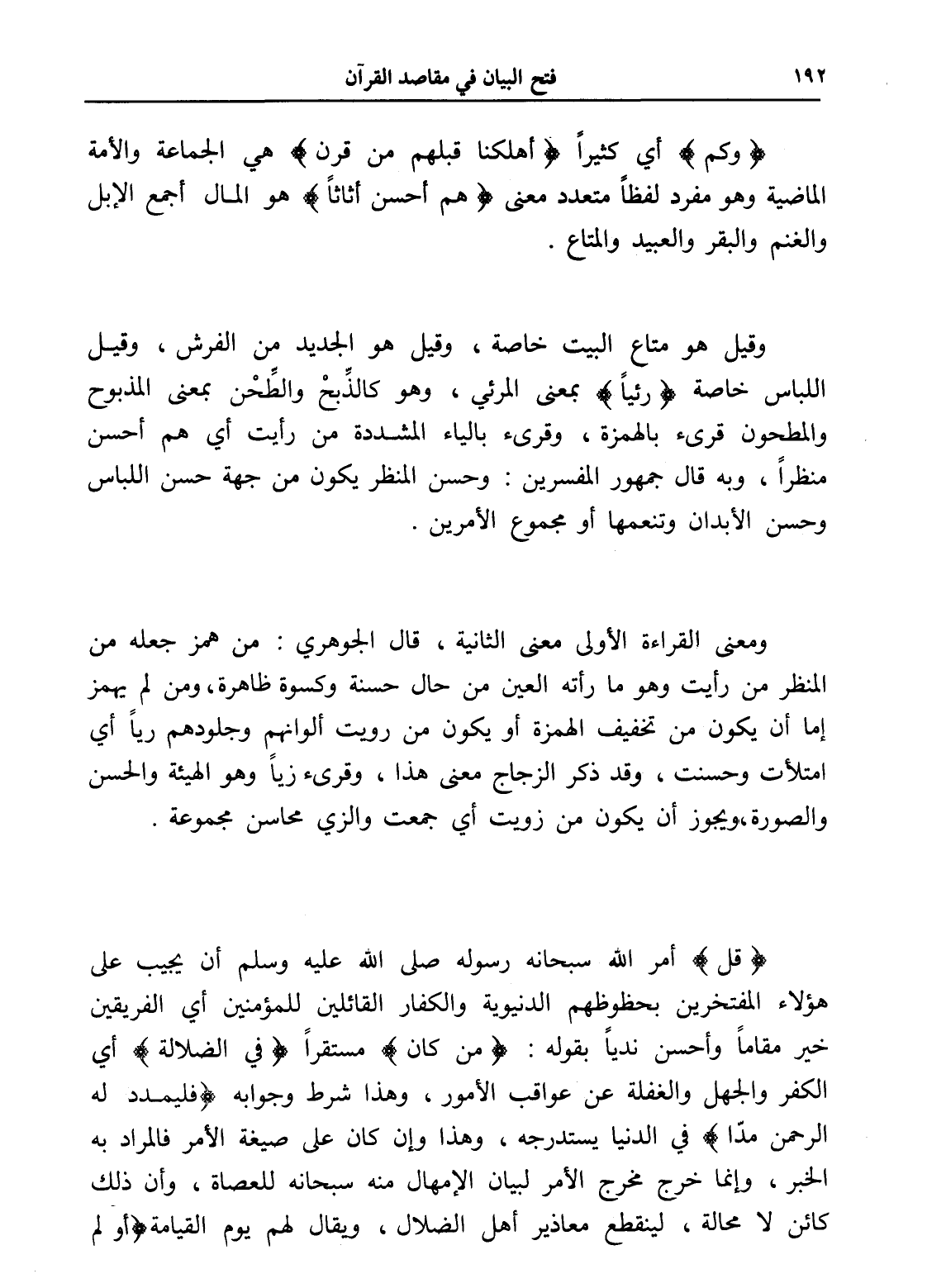 (وكم) أي كثيراً (أهلكنا قبلهم من قرن) هي الجماعة والأمة الماضية وهو مفرد لفظاً متعدد معنى (هم أحسن أثاثاً) هو المال أجمع الإبل والغنم والبقر والعبيد والمتاع.