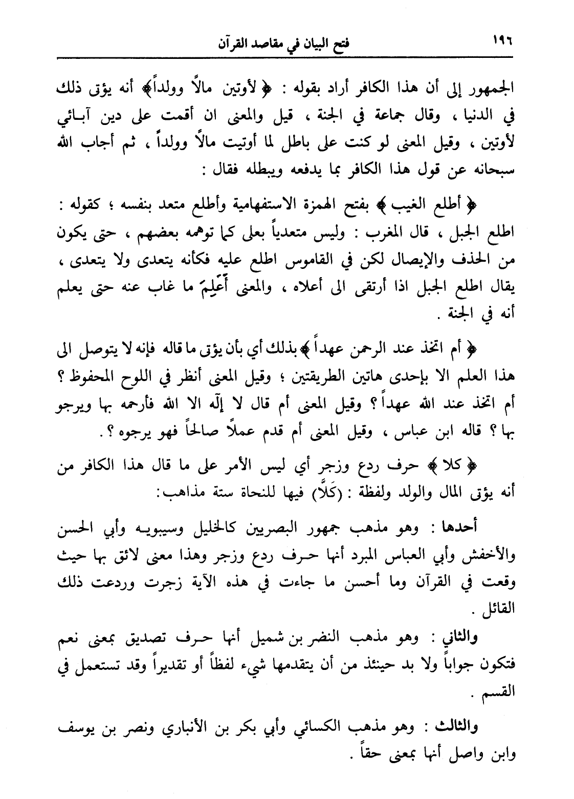 (كلا) حرف ردع وزجر أي ليس الأمر على ما قال هذا الكافر من أنه يؤتى المال والولد ولفظة: (كَلَّا) فيها للنحاة ستة مذاهب: