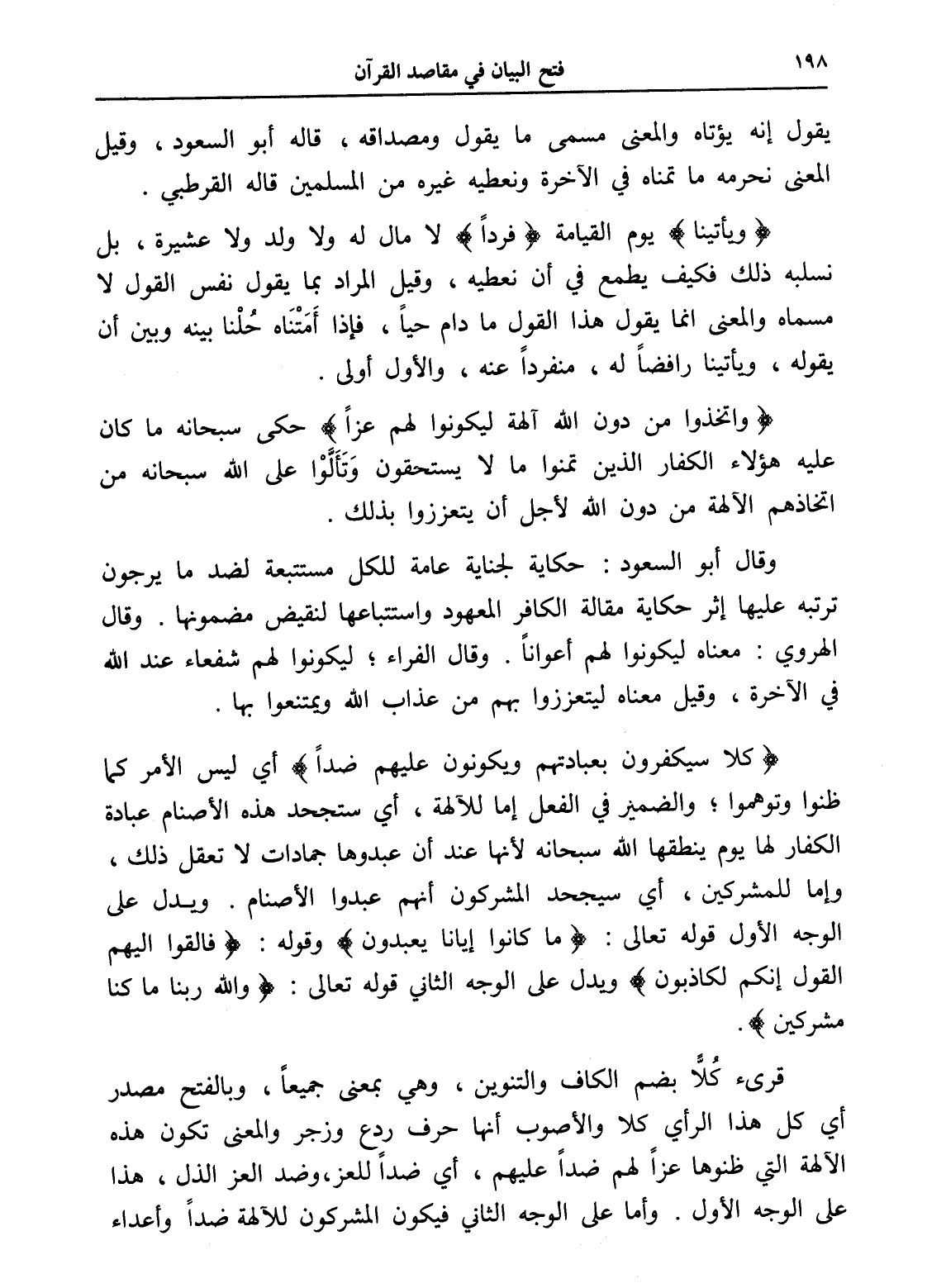 وقال أبو السعود: حكاية لجناية عامة للكل مستتبعة لضد ما يرجون ترتبه عليها إثر حكاية مقالة الكافر المعهود واستتباعها لنقيض مضمونها. وقال الهروي: معناه ليكونوا لهم أعواناً. وقال الفراء؛ ليكونوا لهم شفعاء عند الله في الآخرة، وقيل معناه ليتعززوا بهم من عذاب الله ويمتنعوا بها.