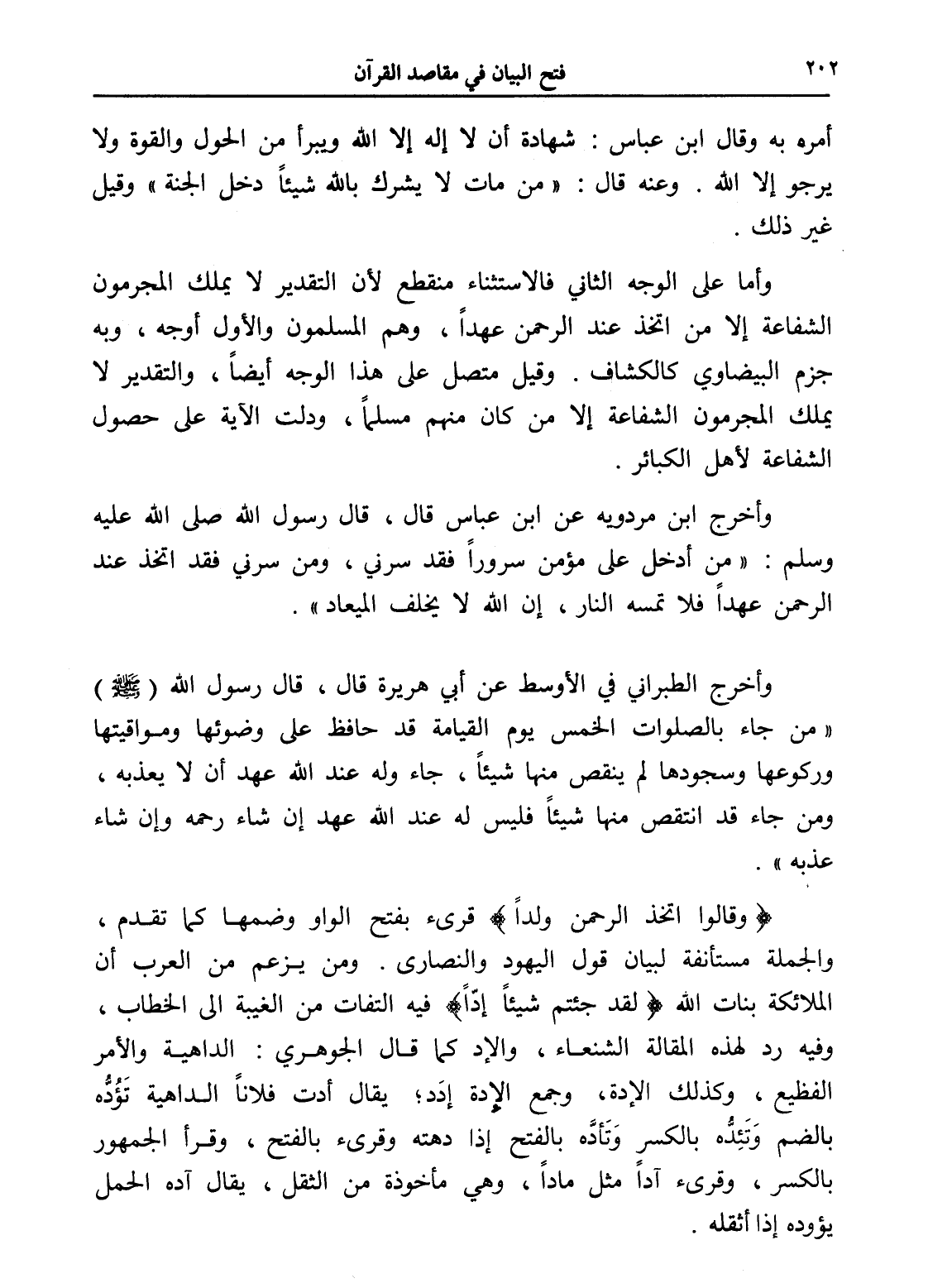 وأما على الوجه الثاني فالاستثناء منقطع لأن التقدير لا يملك المجرمون الشفاعة إلا من اتخذ عند الرحمن عهداً، وهم المسلمون والأول أوجه، وبه جزم البيضاوي كالكشاف. وقيل متصل على هذا الوجه أيضاً، والتقدير لا يملك المجرمون الشفاعة إلا من كان منهم مسلماً، ودلت الآية على حصول الشفاعة لأهل الكبائر.