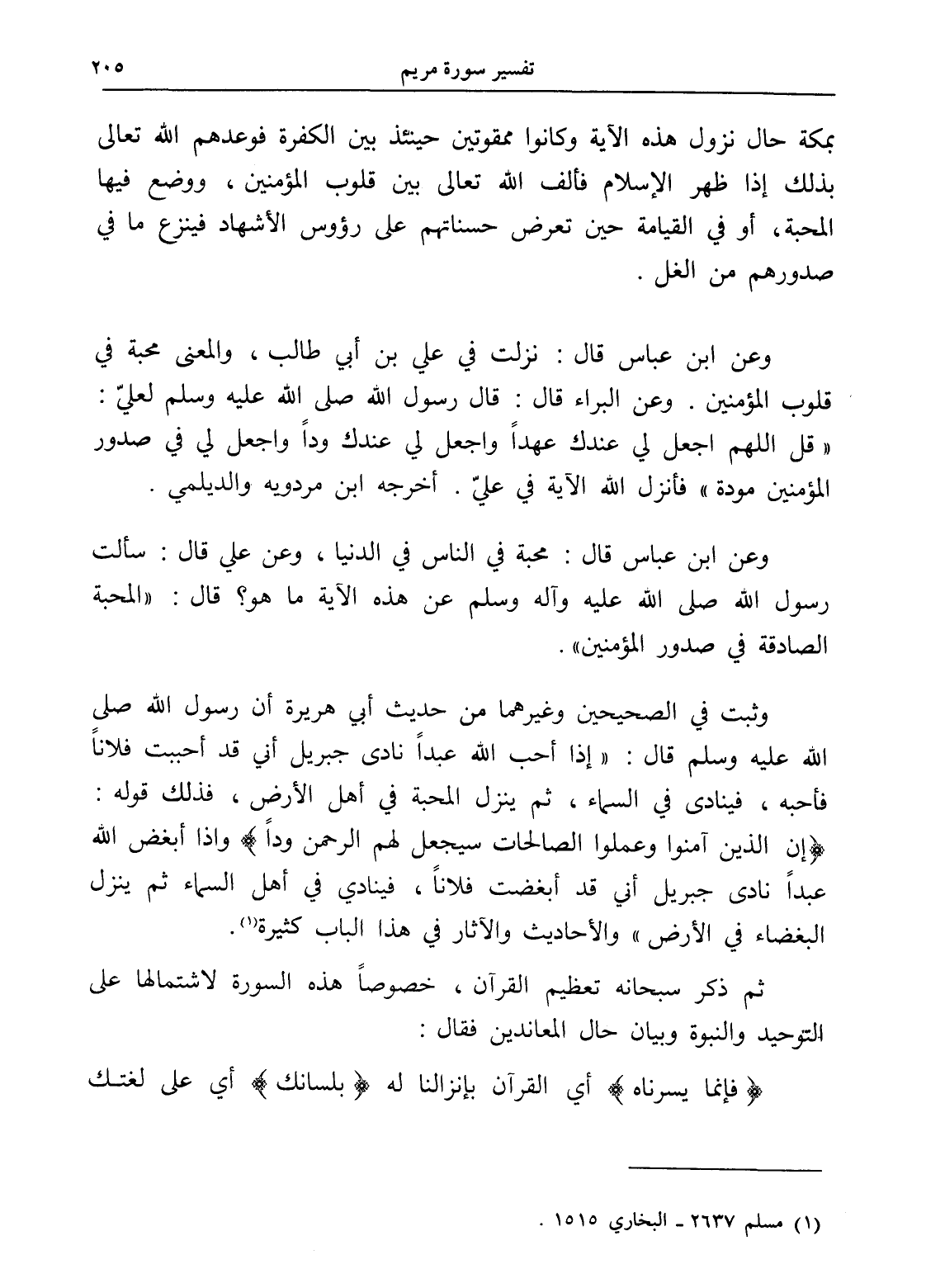 وثبت في الصحيحين وغيرهما من حديث أبي هريرة أن رسول الله صلى الله عليه وسلم قال: " إذا أحب الله عبداً نادى جبريل أني قد أحببت فلاناً فأحبه، فينادى في السماء، ثم ينزل المحبة في أهل الأرض، فذلك قوله: (إن الذين آمنوا وعملوا الصالحات سيجعل لهم الرحمن وداً) وإذا أبغض الله عبداً نادى جبريل أني قد أبغضت فلاناً، فينادي في أهل السماء ثم ينزل البغضاء في الأرض " والأحاديث والآثار في هذا الباب كثيرة (¬1).