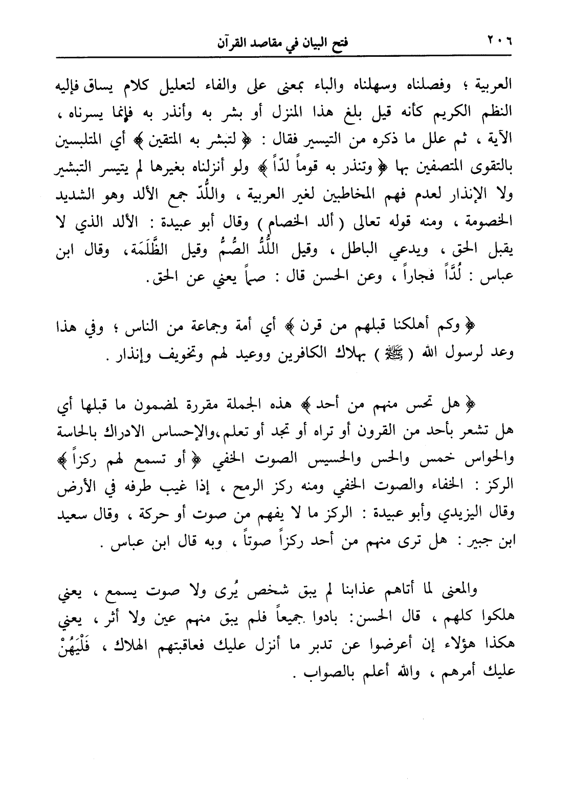 العربية؛ وفصلناه وسهلناه والباء بمعنى على والفاء لتعليل كلام يساق فإليه النظم الكريم كأنه قيل بلغ هذا المنزل أو بشر به وأنذر به فإنما يسرناه، الآية، ثم علل ما ذكره من التيسير فقال: (لتبشر به المتقين) أي المتلبسين بالتقوى المتصفين بها (وتنذر به قوماً لدّاً) ولو أنزلناه بغيرها لم يتيسر التبشير ولا الإنذار لعدم فهم المخاطبين لغير العربية، واللُّدّ جمع الألد وهو الشديد الخصومة، ومنه قوله تعالى (ألد الخصام) وقال أبو عبيدة: الألد الذي لا يقبل الحق، ويدعي الباطل، وقيل اللُّدُّ الصُّمُّ وقيل الظَّلَمَة، وقال ابن عباس: لُدَّاً فجاراً، وعن الحسن قال: صماً يعني عن الحق.