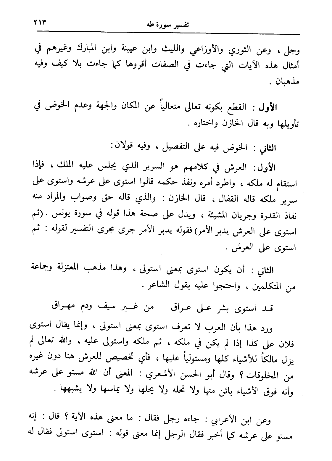 الأول: العرش في كلامهم هو السرير الذي يجلس عليه الملك، فإذا استقام له ملكه، واطرد أمره ونفذ حكمه قالوا استوى على عرشه واستوى على سرير ملكه قاله القفال، قال الخازن: والذي قاله حق وصواب والمراد منه نفاذ القدرة وجريان المشيئة، ويدل على صحة هذا قوله في سورة يونس. (ثم استوى على العرش يدبر الأمر) فقوله يدبر الأمر جرى مجرى التفسير لقوله: ثم استوى على العرش.