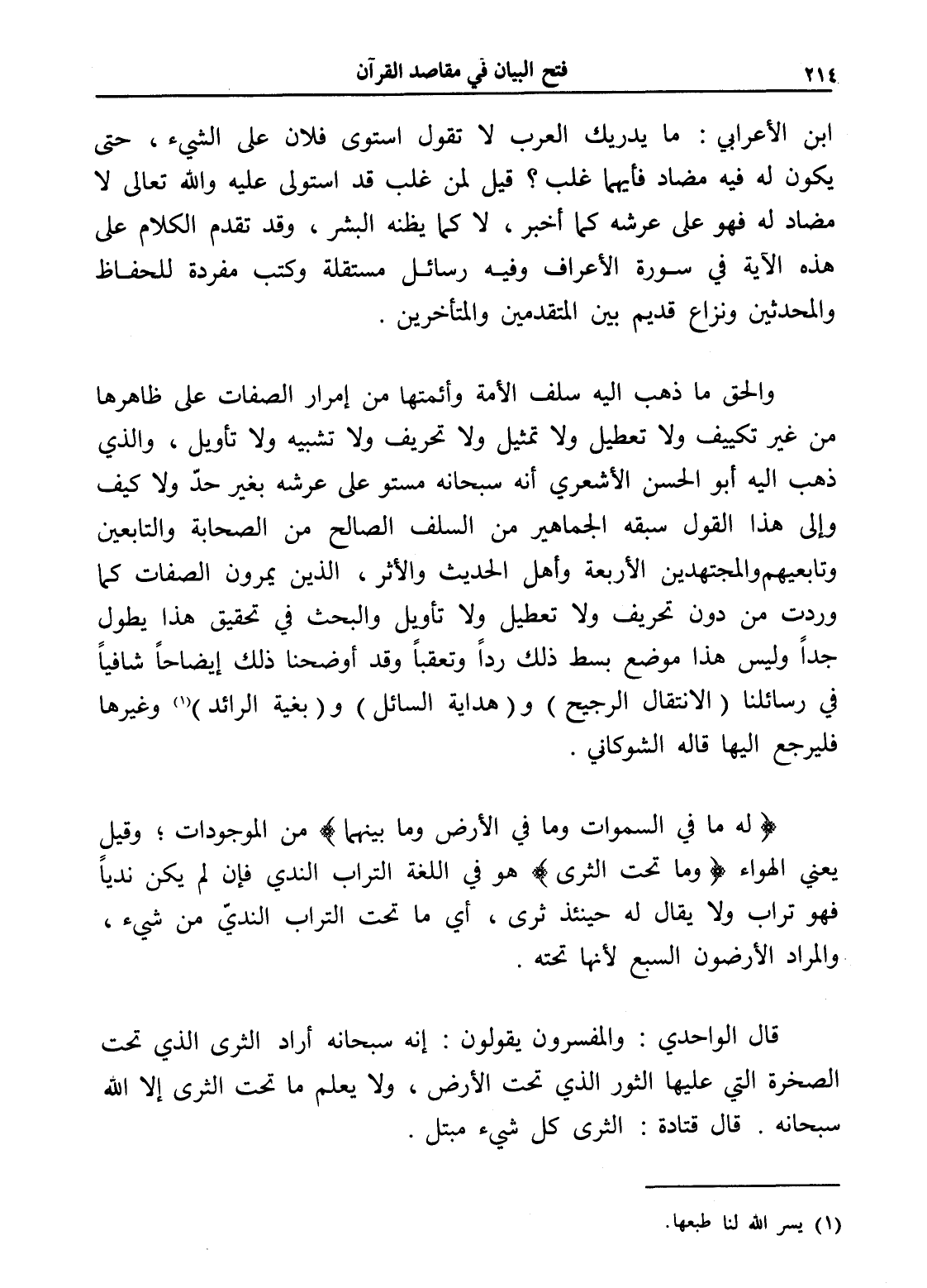 والحق ما ذهب إليه سلف الأمة وأئمتها من إمرار الصفات على ظاهرها من غير تكييف ولا تعطيل ولا تمثيل ولا تحريف ولا تشبيه ولا تأويل، والذي ذهب إليه أبو الحسن الأشعري أنه سبحانه مستو على عرشه بغير حدّ ولا كيف وإلى هذا القول سبقه الجماهير من السلف الصالح من الصحابة والتابعين وتابعيهم والمجتهدين الأربعة وأهل الحديث والأثر، الذين يمرون الصفات كما وردت من دون تحريف ولا تعطيل ولا تأويل والبحث في تحقيق هذا يطول جداً وليس هذا موضع بسط ذلك رداً وتعقباً وقد أوضحنا ذلك إيضاحاً شافياً في رسائلنا (الانتقال الرجيح) و (هداية السائل) و (بغية الرائد) (¬1) وغيرها فليرجع إليها قاله الشوكاني.