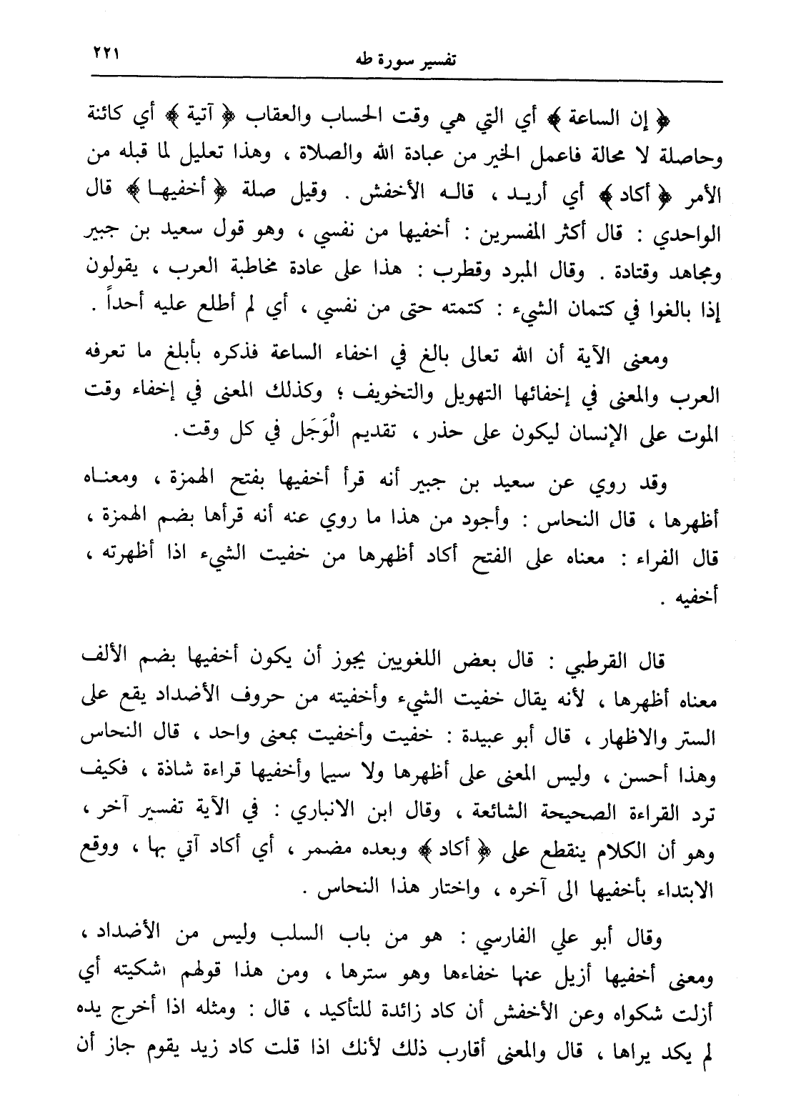قال القرطبي: قال بعض اللغويين يجوز أن يكون أخفيها بضم الألف معناه أظهرها، لأنه يقال خفيت الشيء وأخفيته من حروف الأضداد يقع على الستر والإظهار، قال أبو عبيدة: خفيت وأخفيت بمعنى واحد، قال النحاس وهذا أحسن، وليس المعنى على أظهرها ولا سيما وأخفيها قراءة شاذة، فكيف ترد القراءة الصحيحة الشائعة، وقال ابن الأنباري: في الآية تفسير آخر، وهو أن الكلام ينقطع على (أكاد) وبعده مضمر، أي أكاد آتي بها، ووقع الابتداء بأخفيها إلى آخره، واختار هذا النحاس.