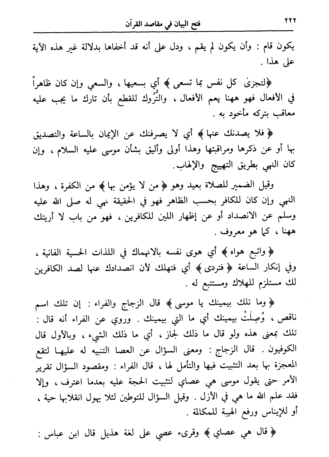 (وما تلك بيمينك يا موسى) قال الزجاج والفراء: إن تلك اسم ناقص، وُصِلَتْ بيمينك أي ما التي بيمينك. وروي عن الفراء أنه قال: تلك بمعنى هذه ولو قال ما ذلك لجاز، أي ما ذلك الشيء، وبالأول قال الكوفيون. قال الزجاج: ومعنى السؤال عن العصا التنبيه له عليها لتقع المعجزة بها بعد التثبيت فيها والتأمل لها، قال الفراء: ومقصود السؤال تقرير الأمر حتى يقول موسى هي عصاي لتثبيت الحجة عليه بعدما اعترف، وإلا فقد علم الله ما هي في الأزل. وقيل السؤال للتوطين لئلا يهول انقلابها حية، أو للإيناس ورفع الهيبة للمكالمة.