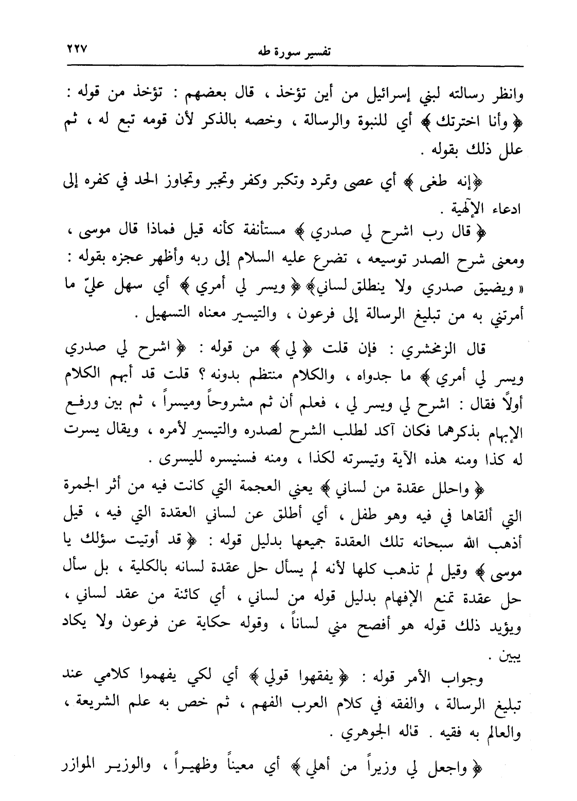 (واحلل عقدة من لساني) يعني العجمة التي كانت فيه من أثر الجمرة التي ألقاها في فيه وهو طفل، أي أطلق عن لساني العقدة التي فيه، قيل أذهب الله سبحانه تلك العقدة جميعها بدليل قوله: (قد أوتيت سؤلك يا موسى) وقيل لم تذهب كلها لأنه لم يسأل حل عقدة لسانه بالكلية، بل سأل حل عقدة تمنع الإفهام بدليل قوله من لساني، أي كائنة من عند لساني، ويؤيد ذلك قوله هو أفصح مني لساناً، وقوله حكاية عن فرعون ولا يكاد يبين.
