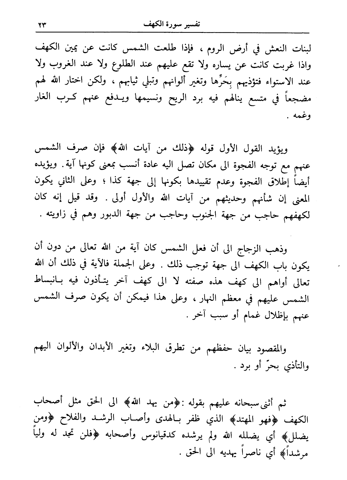 ويؤيد القول الأول قوله (ذلك من آيات الله) فإن صرف الشمس عنهم مع توجه الفجوة إلى مكان تصل إليه عادة أنسب بمعنى كونها آية. ويؤيده أيضاً إطلاق الفجوة وعدم تقييدها بكونها إلى جهة كذا؛ وعلى الثاني يكون المعنى أن شأنهم وحديثهم من آيات الله والأول أولى. وقد قيل إنه كان لكهفهم حاجب من جهة الجنوب وحاجب من جهة الدبور وهم في زاويته.