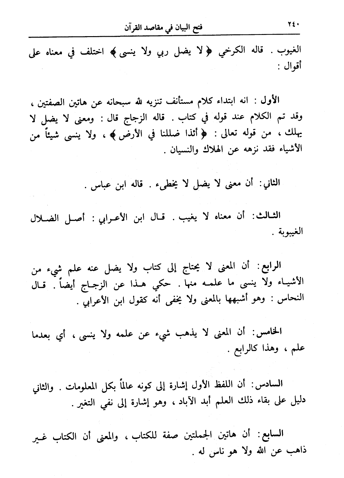 الرابع: أن المعنى لا يحتاج إلى كتاب ولا يضل عنه علم شيء من الأشياء ولا ينسى ما علمه منها. حكي هذا عن الزجاج أيضاً. قال النحاس: وهو أشبهها بالمعنى ولا يخفى أنه كقول ابن الأعرابي.