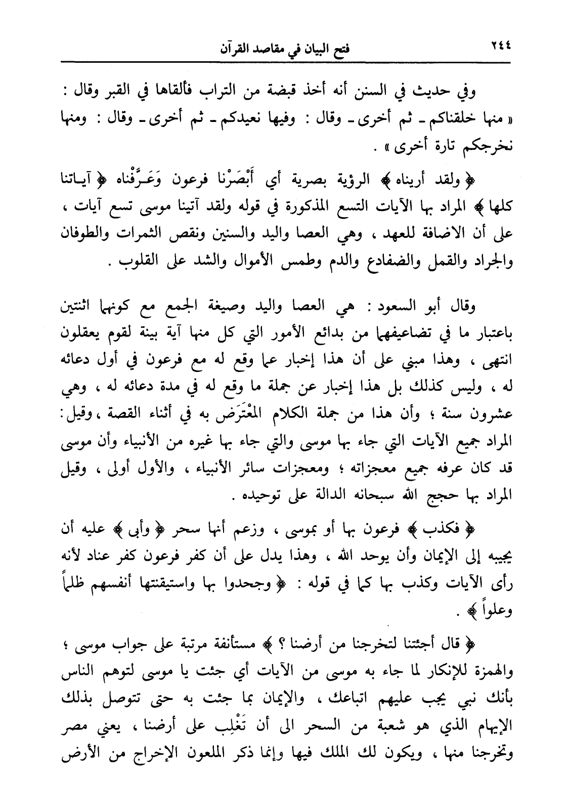 وقال أبو السعود: هي العصا واليد وصيغة الجمع مع كونهما اثنتين باعتبار ما في تضاعيفهما من بدائع الأمور التي كل منها آية بينة لقوم يعقلون انتهى، وهذا مبني على أن هذا إخبار عما وقع له مع فرعون في أول دعائه له، وليس كذلك بل هذا إخبار عن جملة ما وقع له في مدة دعائه له، وهي عشرون سنة؛ وأن هذا من جملة الكلام المعْتَرَض به في أثناء القصة، وقيل: المراد جميع الآيات التي جاء بها موسى والتي جاء بها غيره من الأنبياء وأن موسى قد كان عرفه جميع معجزاته؛ ومعجزات سائر الأنبياء، والأول أولى، وقيل المراد بها حجج الله سبحانه الدالة على توحيده.