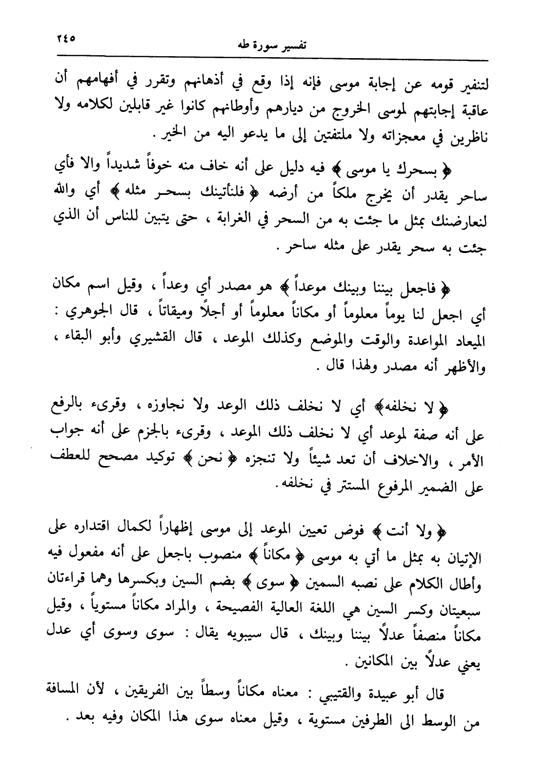 (ولا أنت) فوض تعيين الموعد إلى موسى إظهاراً لكمال اقتداره على الإتيان به بمثل ما أتي به موسى (مكاناً) منصوب باجعل على أنه مفعول فيه وأطال الكلام على نصبه السمين (سوى) بضم السين وبكسرها وهما قراءتان سبعيتان وكسر السين هي اللغة العالية الفصيحة، والمراد مكاناً مستوياً، وقيل مكاناً منصفاً عدلاً بيننا وبينك، قال سيبويه يقال: سوى وسوى أي عدل يعني عدلاً بين المكانين.