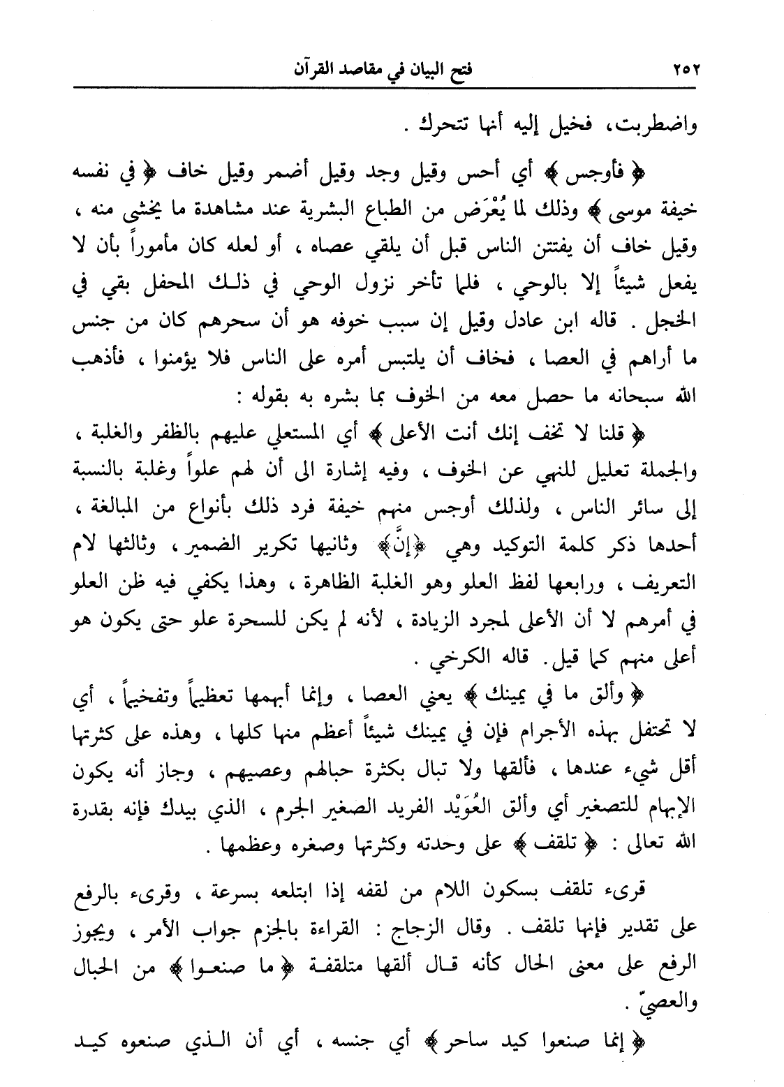 (فأوجس) أي أحس وقيل وجد وقيل أضمر وقيل خاف (في نفسه خيفة موسى) وذلك لما يُعْرَض من الطباع البشرية عند مشاهدة ما يخشى منه، وقيل خاف أن يفتتن الناس قبل أن يلقي عصاه، أو لعله كان مأموراً بأن لا يفعل شيئاً إلا بالوحي، فلما تأخر نزول الوحي في ذلك المحفل بقي في الخجل. قاله ابن عادل وقيل أن سبب خوفه هو أن سحرهم كان من جنس ما أراهم في العصا، فخاف أن يلتبس أمره على الناس فلا يؤمنوا، فأذهب الله سبحانه ما حصل معه من الخوف بما بشره به بقوله: