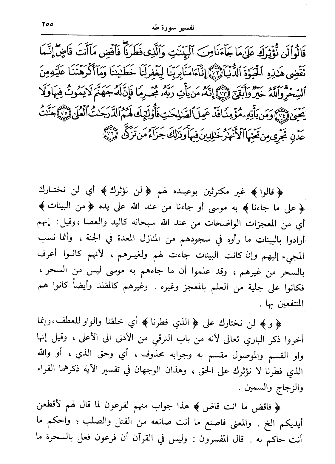 قَالُوا لَنْ نُؤْثِرَكَ عَلَى مَا جَاءَنَا مِنَ الْبَيِّنَاتِ وَالَّذِي فَطَرَنَا فَاقْضِ مَا أَنْتَ قَاضٍ إِنَّمَا تَقْضِي هَذِهِ الْحَيَاةَ الدُّنْيَا (72) إِنَّا آمَنَّا بِرَبِّنَا لِيَغْفِرَ لَنَا خَطَايَانَا وَمَا أَكْرَهْتَنَا عَلَيْهِ مِنَ السِّحْرِ وَاللَّهُ خَيْرٌ وَأَبْقَى (73) إِنَّهُ مَنْ يَأْتِ رَبَّهُ مُجْرِمًا فَإِنَّ لَهُ جَهَنَّمَ لَا يَمُوتُ فِيهَا وَلَا يَحْيَى (74) وَمَنْ يَأْتِهِ مُؤْمِنًا قَدْ عَمِلَ الصَّالِحَاتِ فَأُولَئِكَ لَهُمُ الدَّرَجَاتُ الْعُلَى (75) جَنَّاتُ عَدْنٍ تَجْرِي مِنْ تَحْتِهَا الْأَنْهَارُ خَالِدِينَ فِيهَا وَذَلِكَ جَزَاءُ مَنْ تَزَكَّى (76)