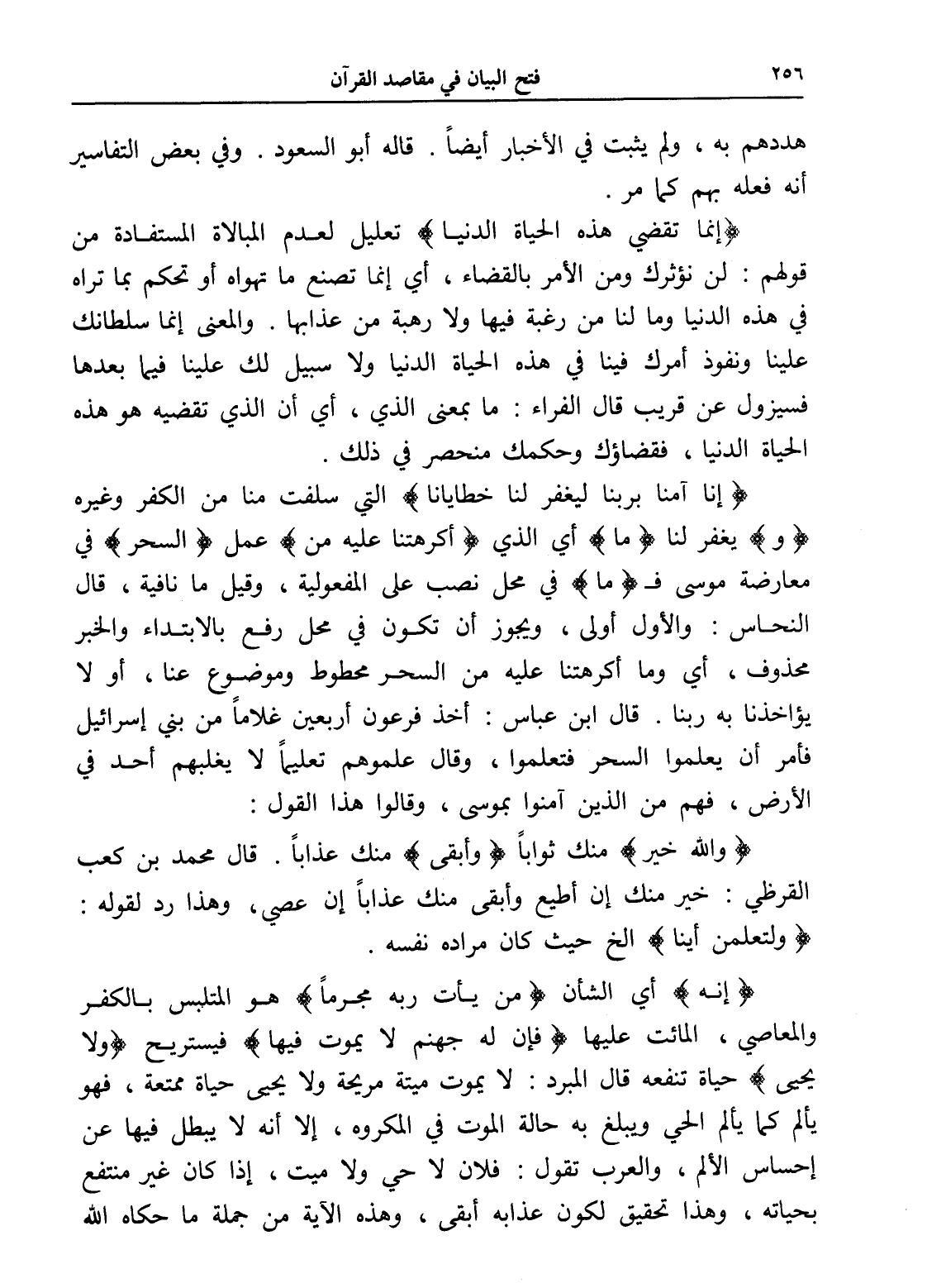 (إنه) أي الشأن (من يأت ربه مجرماً) هو المتلبس بالكفر والمعاصي، المائت عليها (فإن له جهنم لا يموت فيها) فيستريح (ولا يحيى) حياة تنفعه قال المبرد: لا يموت ميتة مريحة ولا يحيى حياة ممتعة، فهو يألم كما يألم الحي ويبلغ به حالة الموت في المكروه، إلا أنه لا يبطل فيها عن إحساس الألم، والعرب تقول: فلان لا حي ولا ميت، إذا كان غير منتفع بحياته، وهذا تحقيق لكون عذابه أبقى، وهذه الآية من جملة ما حكاه الله