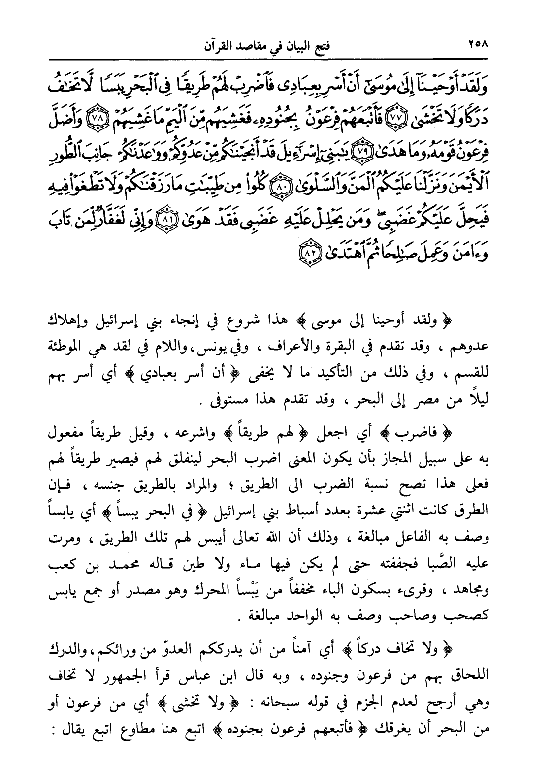 وَلَقَدْ أَوْحَيْنَا إِلَى مُوسَى أَنْ أَسْرِ بِعِبَادِي فَاضْرِبْ لَهُمْ طَرِيقًا فِي الْبَحْرِ يَبَسًا لَا تَخَافُ دَرَكًا وَلَا تَخْشَى (77) فَأَتْبَعَهُمْ فِرْعَوْنُ بِجُنُودِهِ فَغَشِيَهُمْ مِنَ الْيَمِّ مَا غَشِيَهُمْ (78) وَأَضَلَّ فِرْعَوْنُ قَوْمَهُ وَمَا هَدَى (79) يَا بَنِي إِسْرَائِيلَ قَدْ أَنْجَيْنَاكُمْ مِنْ عَدُوِّكُمْ وَوَاعَدْنَاكُمْ جَانِبَ الطُّورِ الْأَيْمَنَ وَنَزَّلْنَا عَلَيْكُمُ الْمَنَّ وَالسَّلْوَى (80) كُلُوا مِنْ طَيِّبَاتِ مَا رَزَقْنَاكُمْ وَلَا تَطْغَوْا فِيهِ فَيَحِلَّ عَلَيْكُمْ غَضَبِي وَمَنْ يَحْلِلْ عَلَيْهِ غَضَبِي فَقَدْ هَوَى (81) وَإِنِّي لَغَفَّارٌ لِمَنْ تَابَ وَآمَنَ وَعَمِلَ صَالِحًا ثُمَّ اهْتَدَى (82)