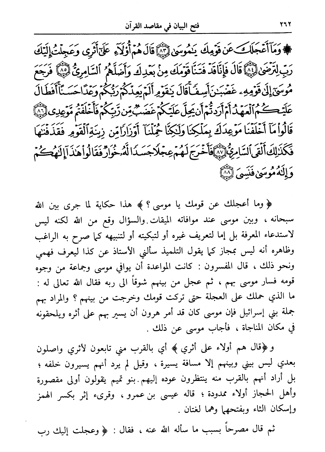 وَمَا أَعْجَلَكَ عَنْ قَوْمِكَ يَا مُوسَى (83) قَالَ هُمْ أُولَاءِ عَلَى أَثَرِي وَعَجِلْتُ إِلَيْكَ رَبِّ لِتَرْضَى (84) قَالَ فَإِنَّا قَدْ فَتَنَّا قَوْمَكَ مِنْ بَعْدِكَ وَأَضَلَّهُمُ السَّامِرِيُّ (85) فَرَجَعَ مُوسَى إِلَى قَوْمِهِ غَضْبَانَ أَسِفًا قَالَ يَا قَوْمِ أَلَمْ يَعِدْكُمْ رَبُّكُمْ وَعْدًا حَسَنًا أَفَطَالَ عَلَيْكُمُ الْعَهْدُ أَمْ أَرَدْتُمْ أَنْ يَحِلَّ عَلَيْكُمْ غَضَبٌ مِنْ رَبِّكُمْ فَأَخْلَفْتُمْ مَوْعِدِي (86) قَالُوا مَا أَخْلَفْنَا مَوْعِدَكَ بِمَلْكِنَا وَلَكِنَّا حُمِّلْنَا أَوْزَارًا مِنْ زِينَةِ الْقَوْمِ فَقَذَفْنَاهَا فَكَذَلِكَ أَلْقَى السَّامِرِيُّ (87) فَأَخْرَجَ لَهُمْ عِجْلًا جَسَدًا لَهُ خُوَارٌ فَقَالُوا هَذَا إِلَهُكُمْ وَإِلَهُ مُوسَى فَنَسِيَ (88)