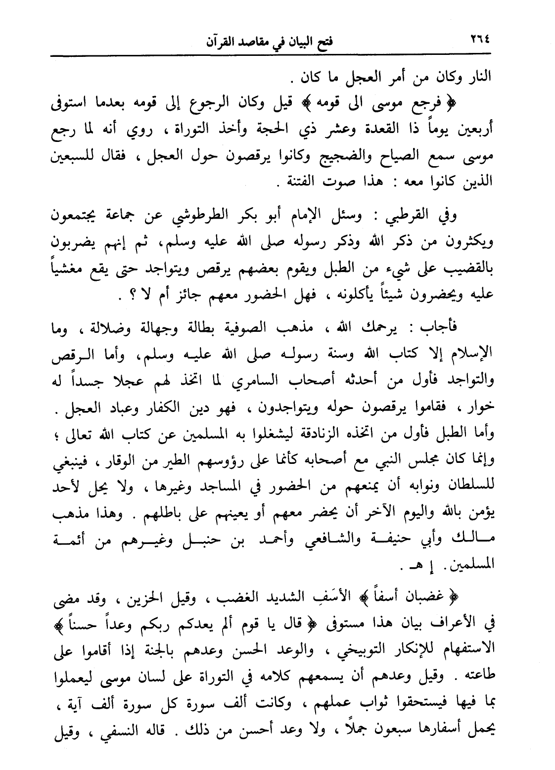 فأجاب: يرحمك الله، مذهب الصوفية بطالة وجهالة وضلالة، وما الإسلام إلا كتاب الله وسنة رسوله صلى الله عليه وسلم، وأما الرقص والتواجد فأول من أحدثه أصحاب السامري لما اتخذ لهم عجلاً جسداً له خوار، فقاموا يرقصون حوله ويتواجدون، فهو دين الكفار وعباد العجل. وأما الطبل فأول من اتخذه الزنادقة ليشغلوا به المسلمين عن كتاب الله تعالى؛ وإنما كان مجلس النبي مع أصحابه كأنما على رؤوسهم الطير من الوقار، فينبغي للسلطان ونوابه أن يمنعهم من الحضور في المساجد وغيرها، ولا يحل لأحد يؤمن بالله واليوم الآخر أن يحضر معهم أو يعينهم على باطلهم. وهذا مذهب مالك وأبي حنيفة والشافعي وأحمد بن حنبل وغيرهم من أئمة المسلمين. إهـ.
