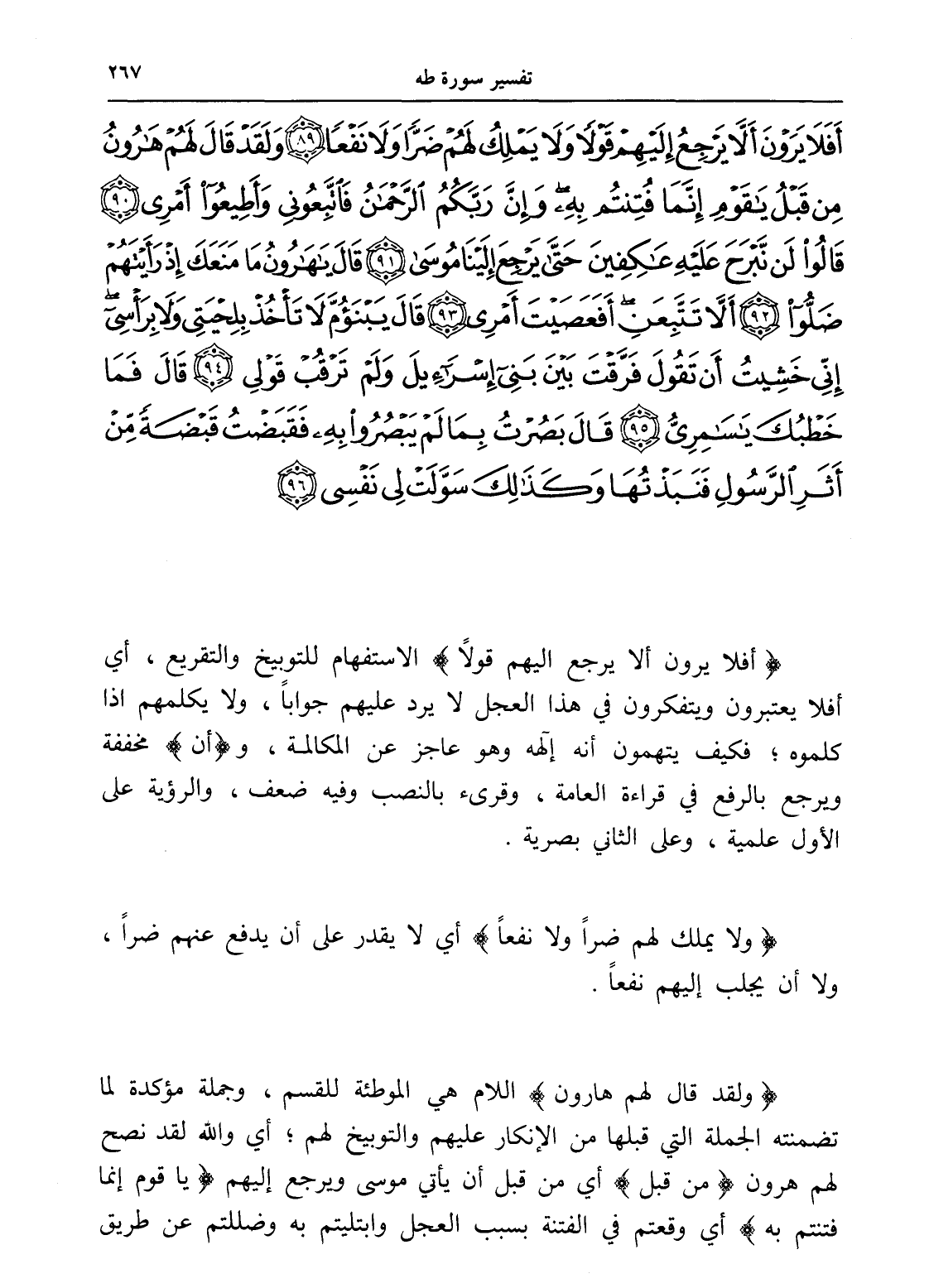 أَفَلَا يَرَوْنَ أَلَّا يَرْجِعُ إِلَيْهِمْ قَوْلًا وَلَا يَمْلِكُ لَهُمْ ضَرًّا وَلَا نَفْعًا (89) وَلَقَدْ قَالَ لَهُمْ هَارُونُ مِنْ قَبْلُ يَا قَوْمِ إِنَّمَا فُتِنْتُمْ بِهِ وَإِنَّ رَبَّكُمُ الرَّحْمَنُ فَاتَّبِعُونِي وَأَطِيعُوا أَمْرِي (90) قَالُوا لَنْ نَبْرَحَ عَلَيْهِ عَاكِفِينَ حَتَّى يَرْجِعَ إِلَيْنَا مُوسَى (91) قَالَ يَا هَارُونُ مَا مَنَعَكَ إِذْ رَأَيْتَهُمْ ضَلُّوا (92) أَلَّا تَتَّبِعَنِ أَفَعَصَيْتَ أَمْرِي (93) قَالَ يَبْنَؤُمَّ لَا تَأْخُذْ بِلِحْيَتِي وَلَا بِرَأْسِي إِنِّي خَشِيتُ أَنْ تَقُولَ فَرَّقْتَ بَيْنَ بَنِي إِسْرَائِيلَ وَلَمْ تَرْقُبْ قَوْلِي (94) قَالَ فَمَا خَطْبُكَ يَا سَامِرِيُّ (95) قَالَ بَصُرْتُ بِمَا لَمْ يَبْصُرُوا بِهِ فَقَبَضْتُ قَبْضَةً مِنْ أَثَرِ الرَّسُولِ فَنَبَذْتُهَا وَكَذَلِكَ سَوَّلَتْ لِي نَفْسِي (96)