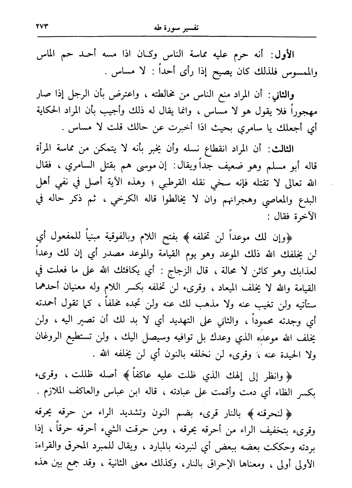 والثاني: أن المراد منع الناس من مخالطته، واعترض بأن الرجل إذا صار مهجوراً فلا يقول هو لا مساس، وإنما يقال له ذلك وأجيب بأن المراد الحكاية أي أجعلك يا سامري بحيث إذا أخبرت عن حالك قلت لا مساس.
