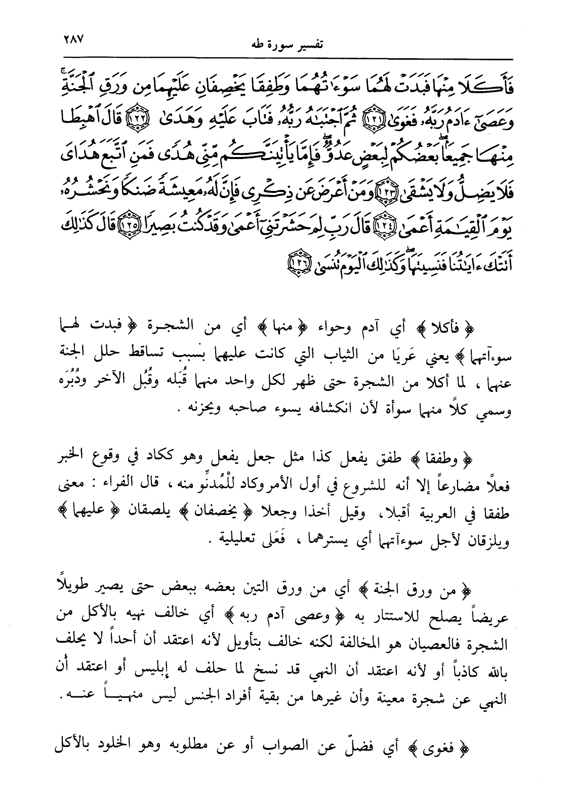 فَأَكَلَا مِنْهَا فَبَدَتْ لَهُمَا سَوْآتُهُمَا وَطَفِقَا يَخْصِفَانِ عَلَيْهِمَا مِنْ وَرَقِ الْجَنَّةِ وَعَصَى آدَمُ رَبَّهُ فَغَوَى (121) ثُمَّ اجْتَبَاهُ رَبُّهُ فَتَابَ عَلَيْهِ وَهَدَى (122) قَالَ اهْبِطَا مِنْهَا جَمِيعًا بَعْضُكُمْ لِبَعْضٍ عَدُوٌّ فَإِمَّا يَأْتِيَنَّكُمْ مِنِّي هُدًى فَمَنِ اتَّبَعَ هُدَايَ فَلَا يَضِلُّ وَلَا يَشْقَى (123) وَمَنْ أَعْرَضَ عَنْ ذِكْرِي فَإِنَّ لَهُ مَعِيشَةً ضَنْكًا وَنَحْشُرُهُ يَوْمَ الْقِيَامَةِ أَعْمَى (124) قَالَ رَبِّ لِمَ حَشَرْتَنِي أَعْمَى وَقَدْ كُنْتُ بَصِيرًا (125) قَالَ كَذَلِكَ أَتَتْكَ آيَاتُنَا فَنَسِيتَهَا وَكَذَلِكَ الْيَوْمَ تُنْسَى (126)