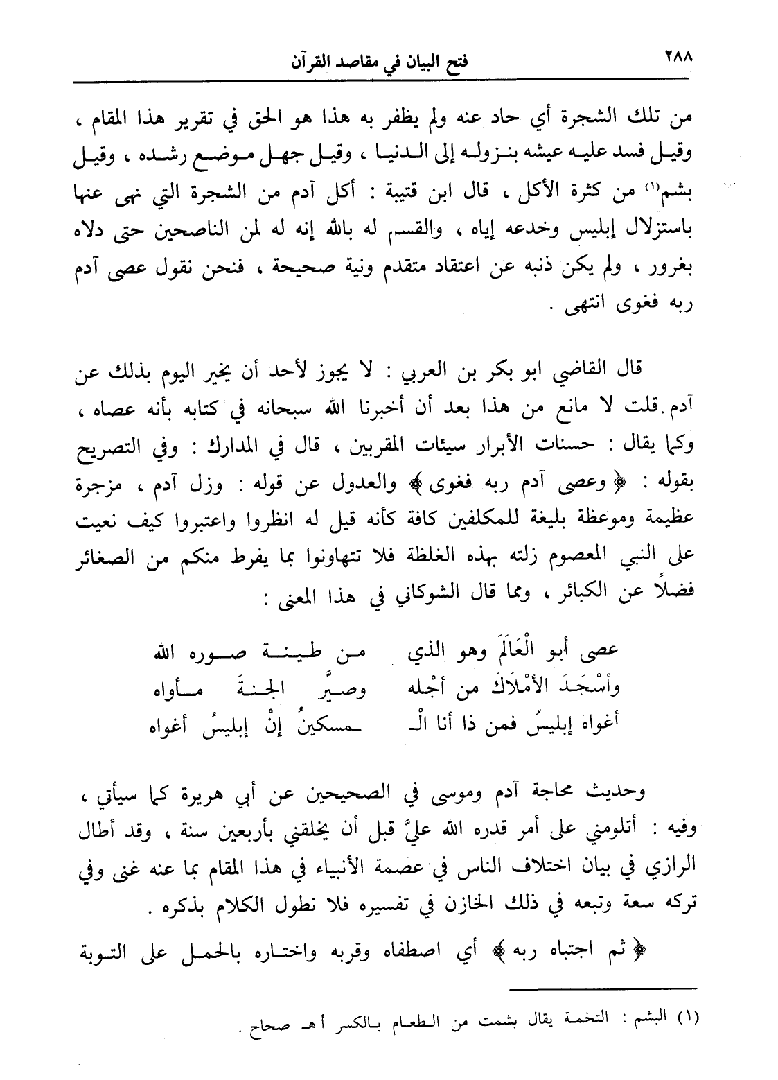 وحديث محاجة آدم وموسى في الصحيحين عن أبي هريرة كما سيأتي، وفيه: أتلومني على أمر قدره الله عليَّ قبل أن يخلقني بأربعين سنة، وقد أطال الرازي في بيان اختلاف الناس في عصمة الأنبياء في هذا المقام بما عنه غنى وفي تركه سعة وتبعه في ذلك الخازن في تفسيره فلا نطول الكلام بذكره.