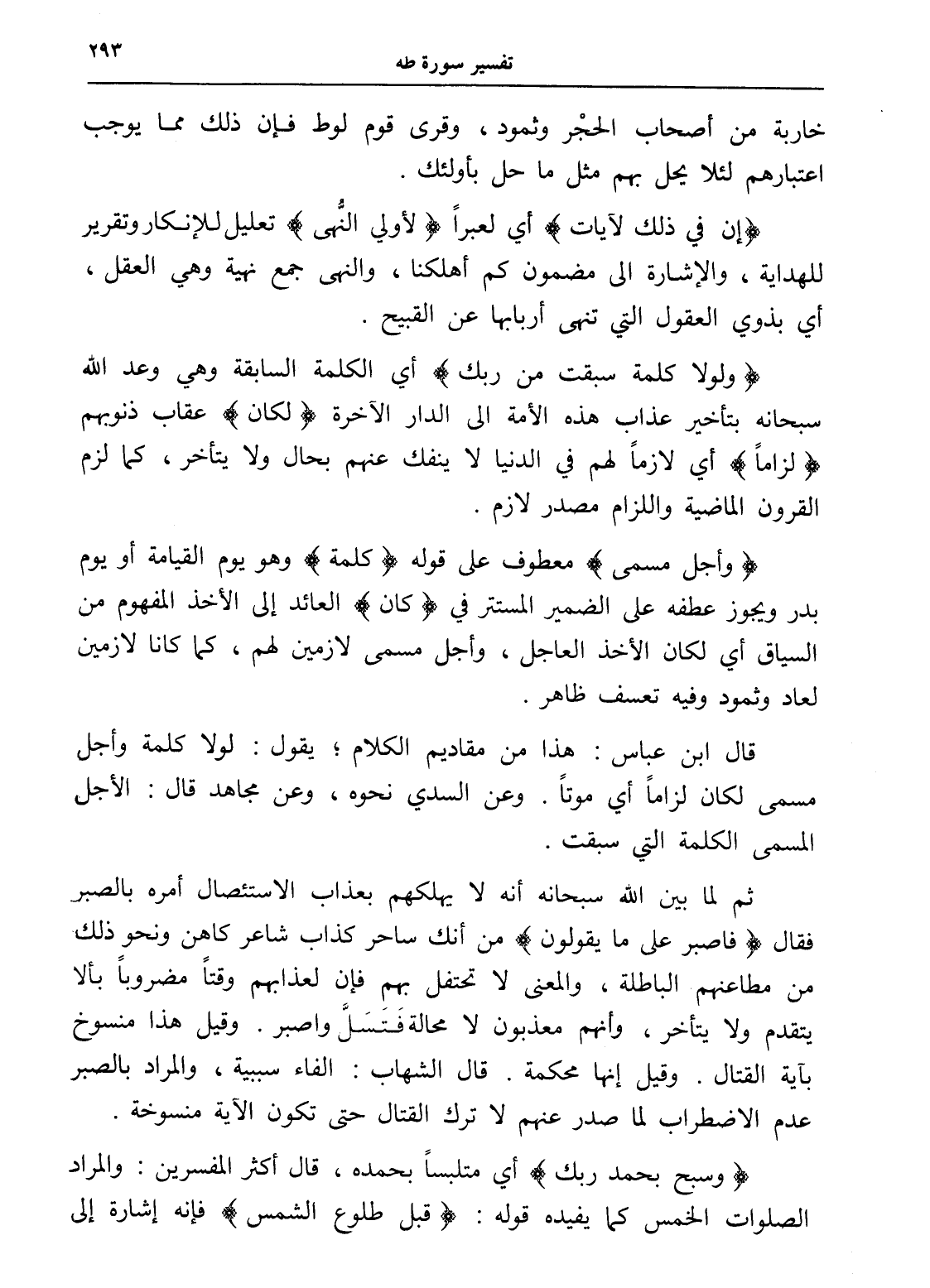 قال ابن عباس: هذا من مقاديم الكلام؛ يقول: لولا كلمة وأجل مسمى لكان لزاماً أي موتاً. وعن السدي نحوه، وعن مجاهد قال: الأجل المسمى الكلمة التي سبقت.