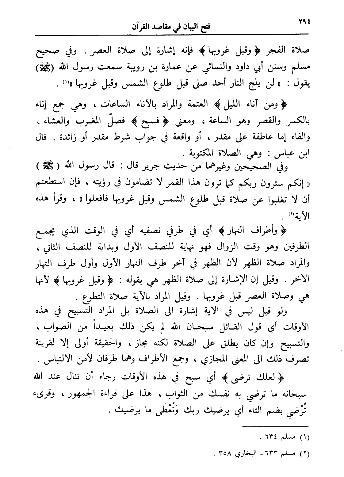 صلاة الفجر (وقبل غروبها) فإنه إشارة إلى صلاة العصر. وفي صحيح مسلم وسنن أبي داود والنسائي عن عمارة بن رويبة سمعت رسول الله (- صلى الله عليه وسلم -) يقول: " لن يلج النار أحد صلى قبل طلوع الشمس وقبل غروبها " (¬1).