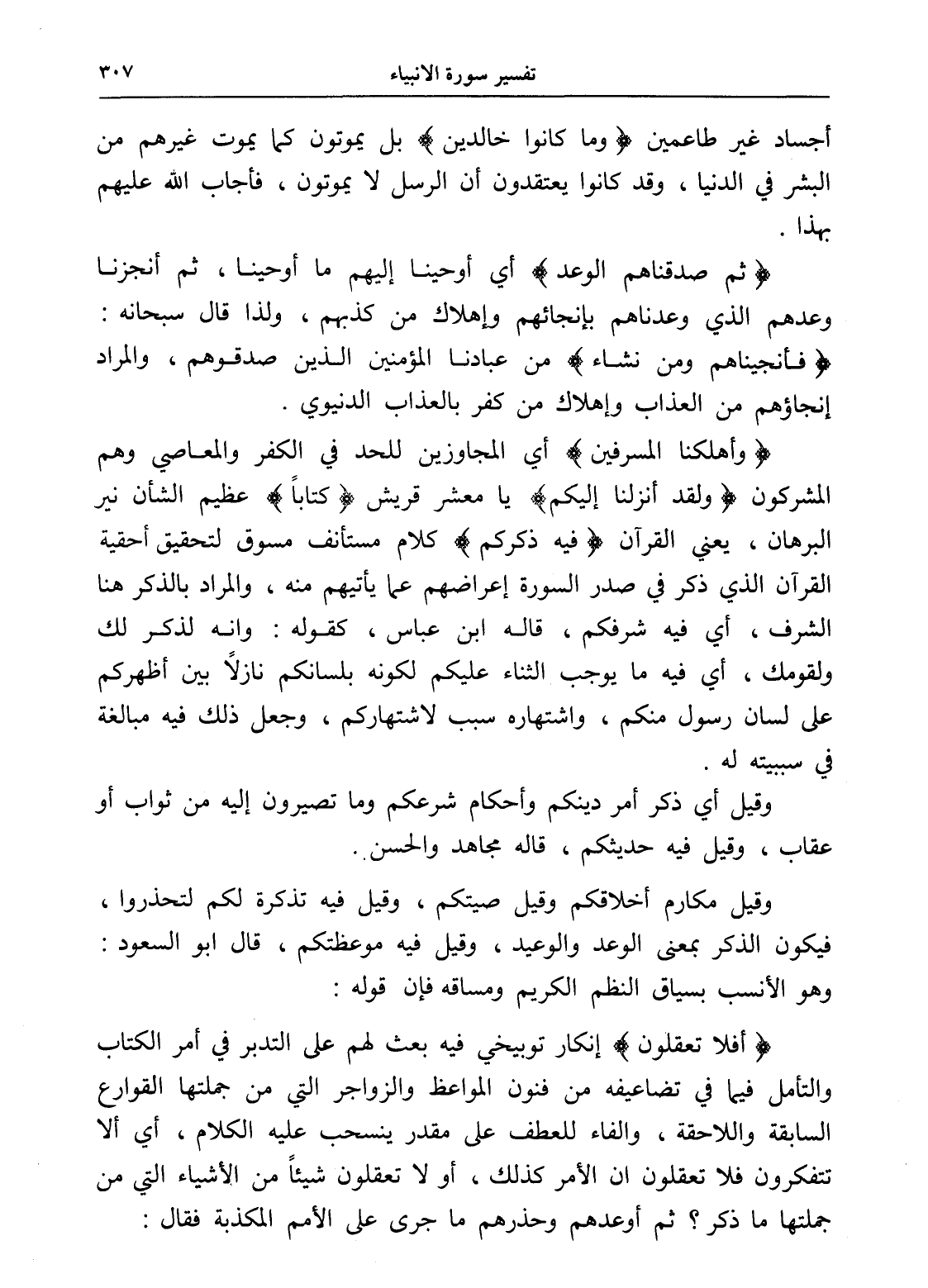 أجساد غير طاعمين (وما كانوا خالدين) بل يموتون كما يموت غيرهم من البشر في الدنيا، وقد كانوا يعتقدون أن الرسل لا يموتون، فأجاب الله عليهم بهذا.