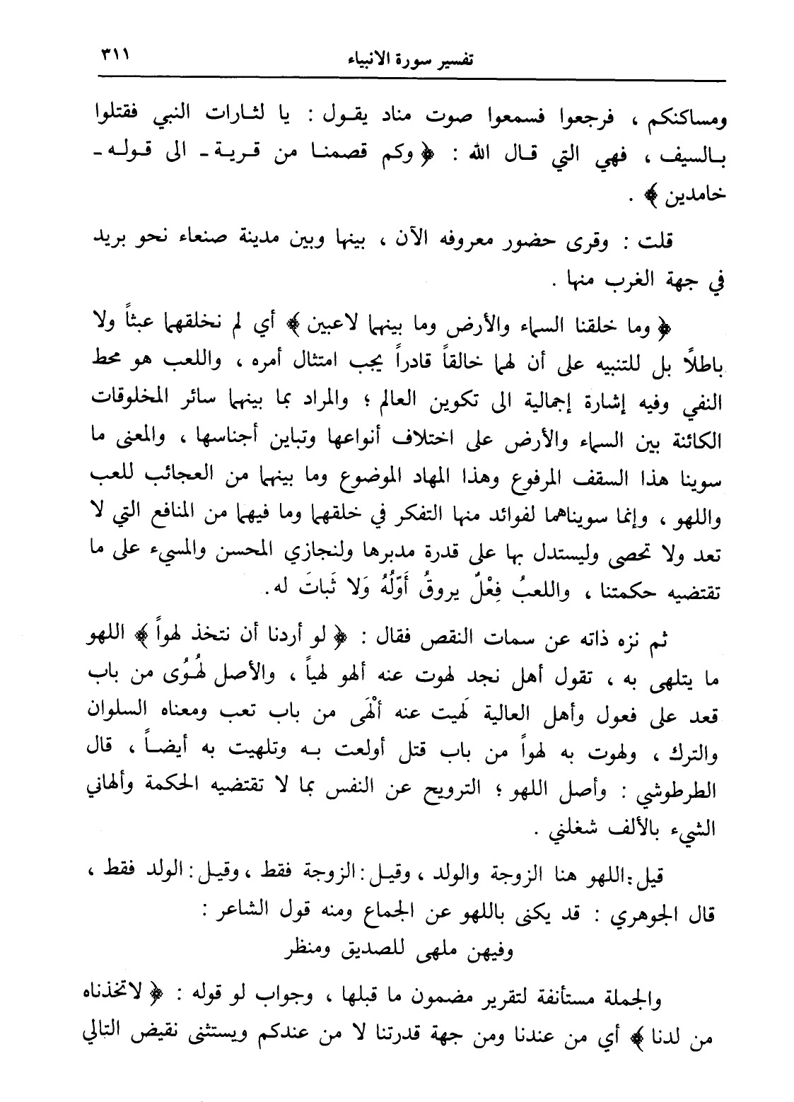 (وما خلقنا السماء والأرض وما بينهما لاعبين) أي لم نخلقهما عبثاً ولا باطلاً بل للتنبيه على أن لهما خالقاً قادراً يجب امتثال أمره، واللعب هو محط النفي وفيه إشارة إجمالية إلى تكوين العالم؛ والمراد بما بينهما سائر المخلوقات الكائنة بين السماء والأرض على اختلاف أنواعها وتباين أجناسها، والمعنى ما سوينا هذا السقف المرفوع وهذا المهاد الموضوع وما بينهما من العجائب للعب واللهو، وإنما سويناهما لفوائد منها التفكر في خلقهما وما فيهما من المنافع التي لا تعد ولا تحصى وليستدل بها على قدرة مدبرها ولنجازي المحسن والمسيء على ما تقتضيه حكمتنا، واللعبُ فعْلٌ يروقُ أَوّلُهُ وَلا ثباتَ له.