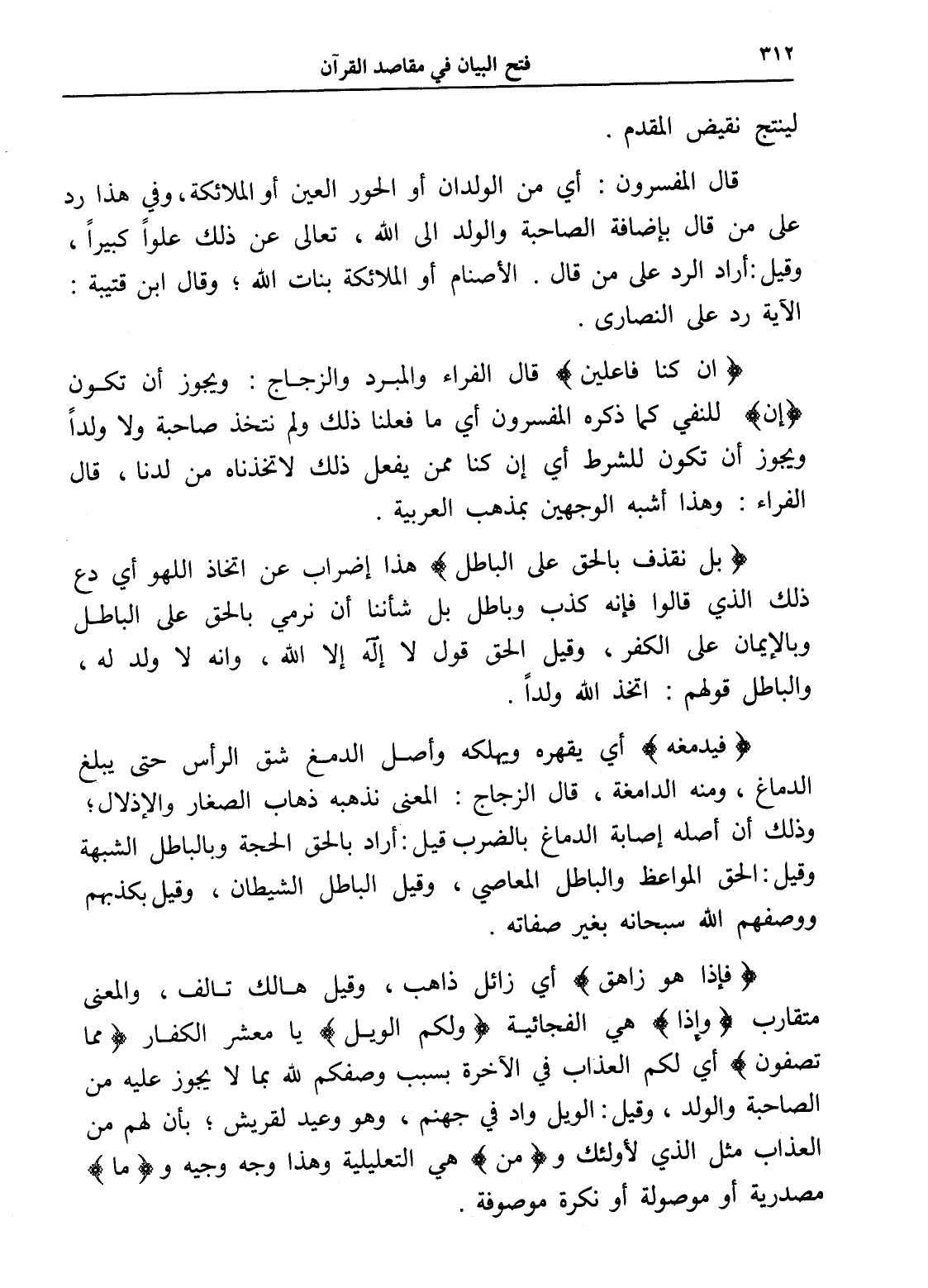 (إن كنا فاعلين) قال الفراء والمبرد والزجاج: ويجوز أن تكون (إن) للنفي كما ذكره المفسرون أي ما فعلنا ذلك ولم نتخذ صاحبة ولا ولداً ويجوز أن تكون للشرط أي إن كنا ممن يفعل ذلك لاتخذناه من لدنا، قال الفراء: وهذا أشبه الوجهين بمذهب العربية.