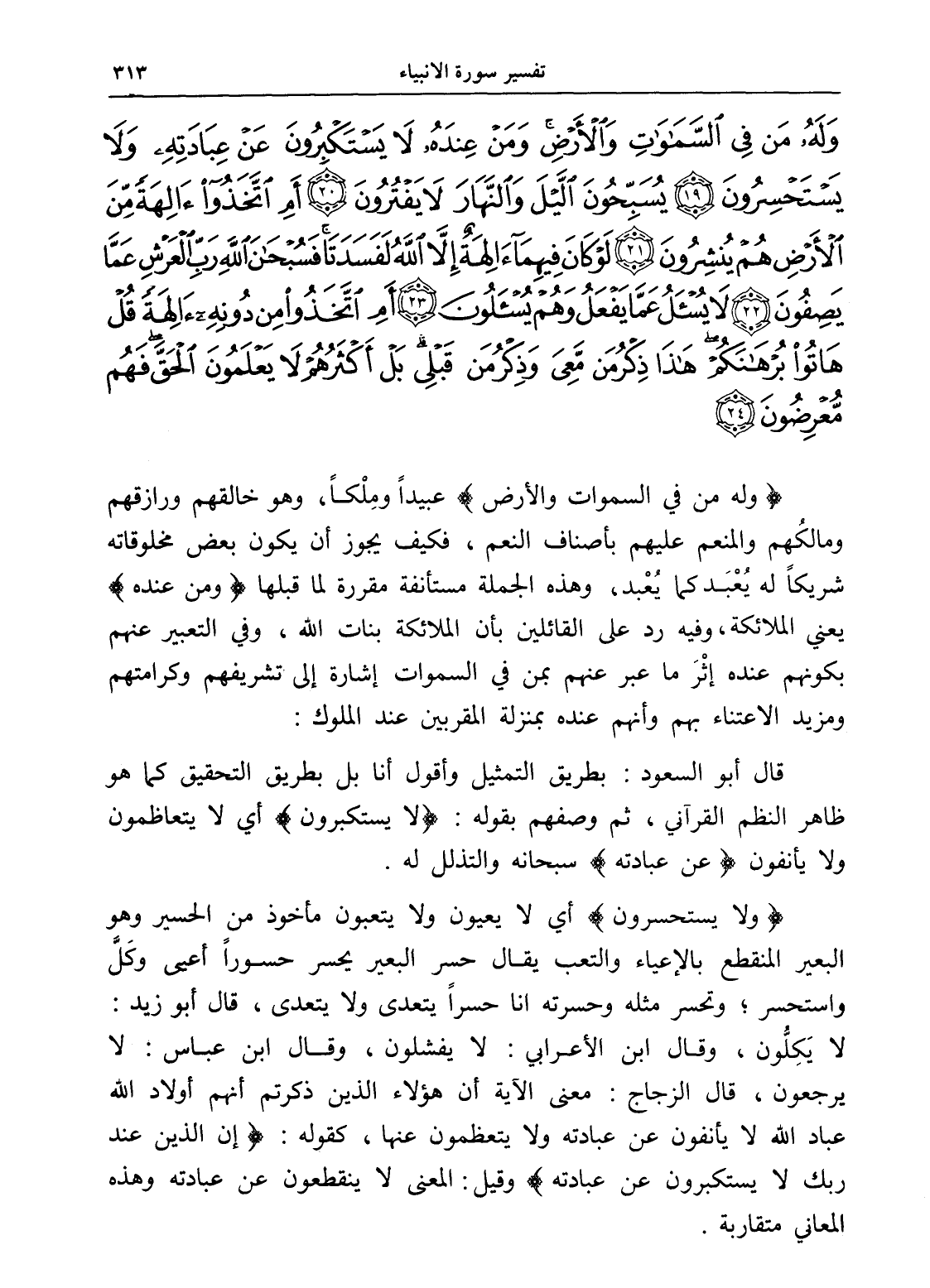 وَلَهُ مَنْ فِي السَّمَاوَاتِ وَالْأَرْضِ وَمَنْ عِنْدَهُ لَا يَسْتَكْبِرُونَ عَنْ عِبَادَتِهِ وَلَا يَسْتَحْسِرُونَ (19) يُسَبِّحُونَ اللَّيْلَ وَالنَّهَارَ لَا يَفْتُرُونَ (20) أَمِ اتَّخَذُوا آلِهَةً مِنَ الْأَرْضِ هُمْ يُنْشِرُونَ (21) لَوْ كَانَ فِيهِمَا آلِهَةٌ إِلَّا اللَّهُ لَفَسَدَتَا فَسُبْحَانَ اللَّهِ رَبِّ الْعَرْشِ عَمَّا يَصِفُونَ (22) لَا يُسْأَلُ عَمَّا يَفْعَلُ وَهُمْ يُسْأَلُونَ (23) أَمِ اتَّخَذُوا مِنْ دُونِهِ آلِهَةً قُلْ هَاتُوا بُرْهَانَكُمْ هَذَا ذِكْرُ مَنْ مَعِيَ وَذِكْرُ مَنْ قَبْلِي بَلْ أَكْثَرُهُمْ لَا يَعْلَمُونَ الْحَقَّ فَهُمْ مُعْرِضُونَ (24)