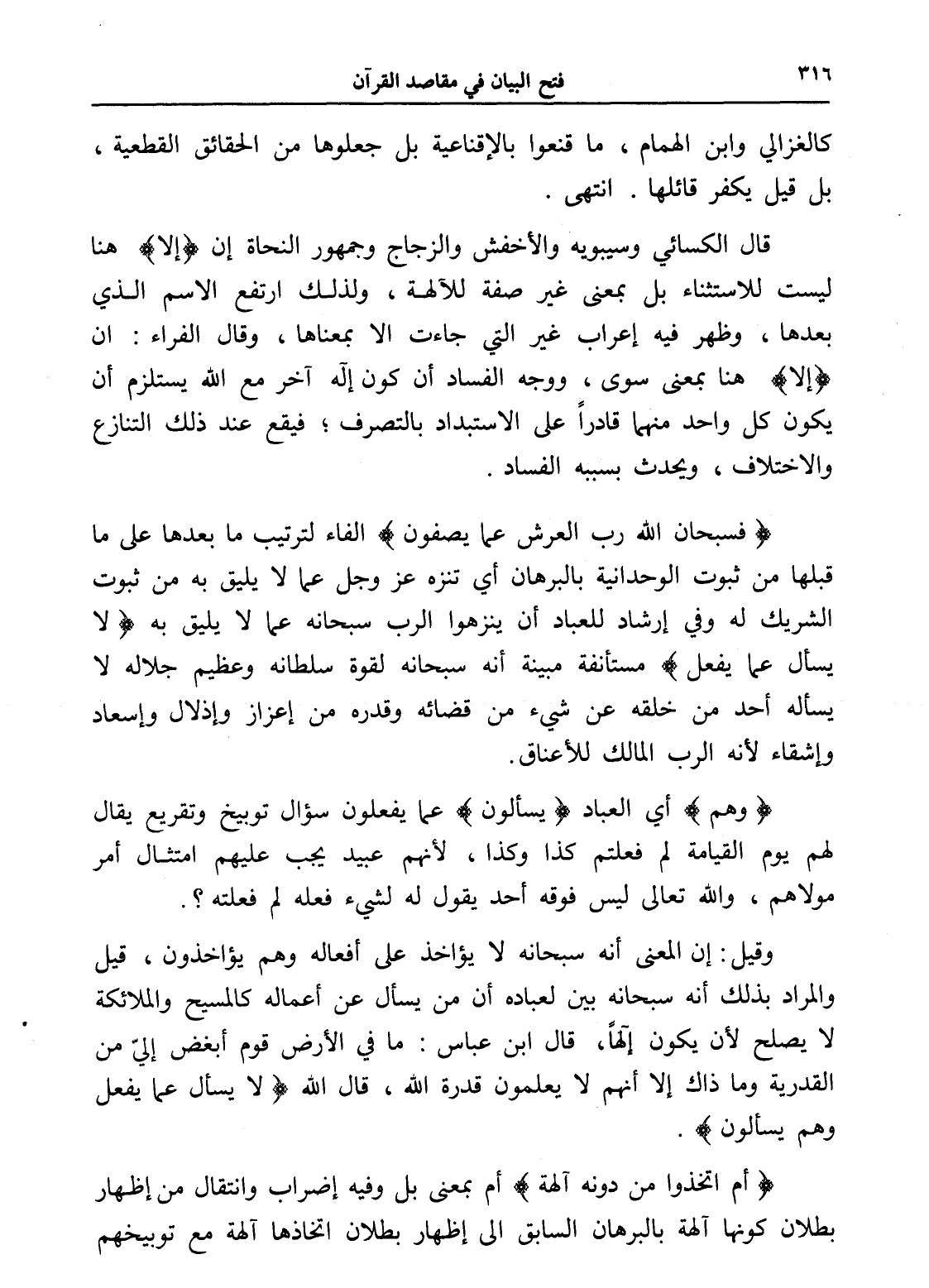 وقيل: أن المعنى أنه سبحانه لا يؤاخذ على أفعاله وهم يؤاخذون، قيل والمراد بذلك أنه سبحانه بين لعباده أن من يسأل عن أعماله كالمسيح والملائكة لا يصلح لأن يكون إلهاً، قال ابن عباس: ما في الأرض قوم أبغض إليّ من القدرية وما ذاك إلا أنهم لا يعلمون قدرة الله، قال الله (لا يسأل عما يفعل وهم يسألون).